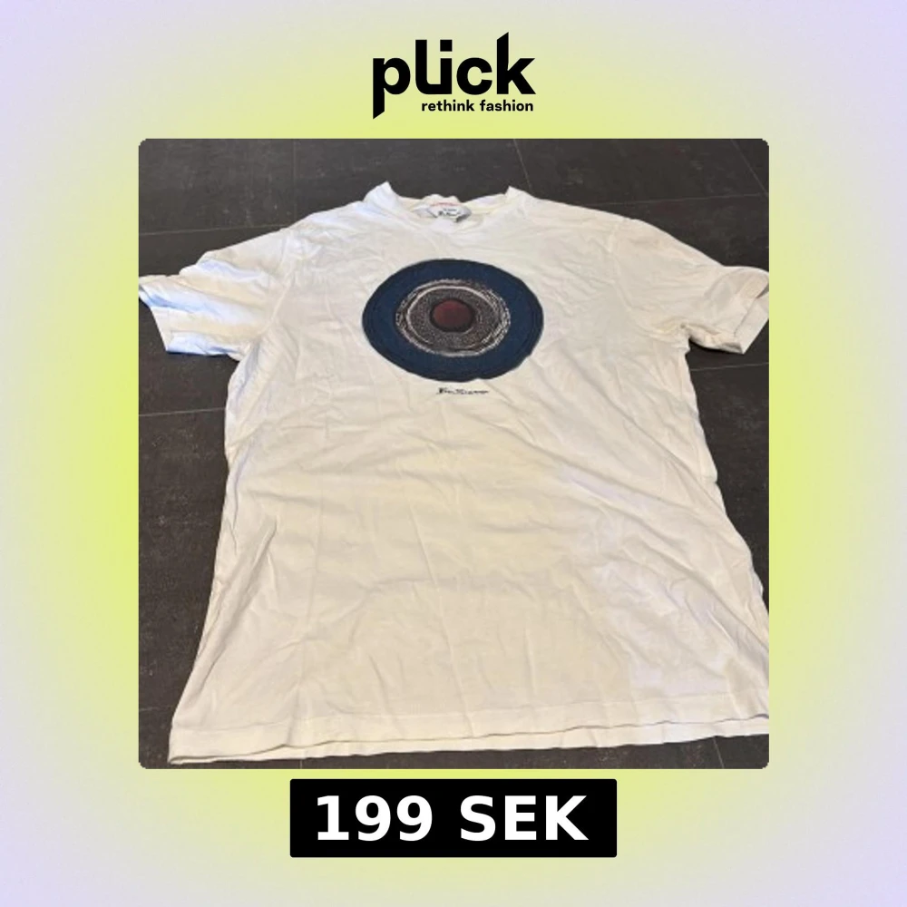 Vit t-shirt från Ben Sherman med ett stort, cirkulärt tryck i blått, rött och svart på bröstet. Klassisk rund hals och korta ärmar. Materialet är mjuk bomull som känns skönt mot huden. Perfekt för dig som gillar grafiska prints och stilren design.