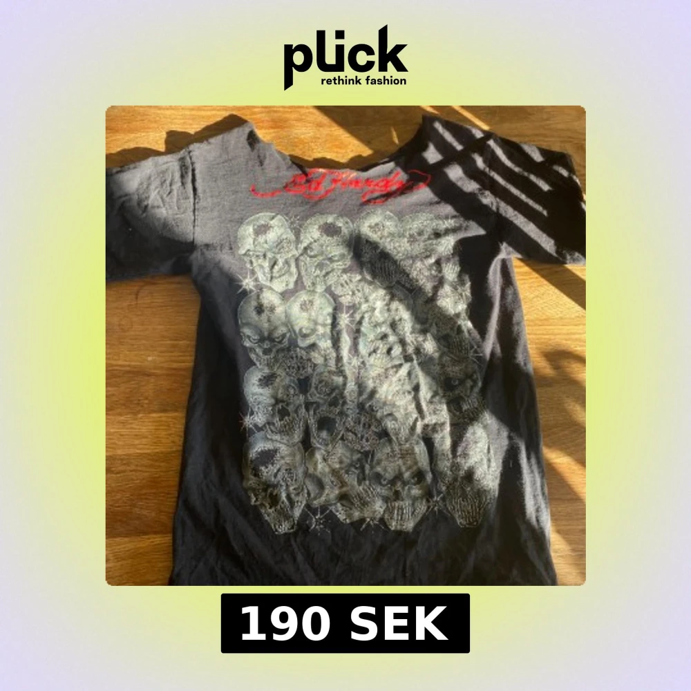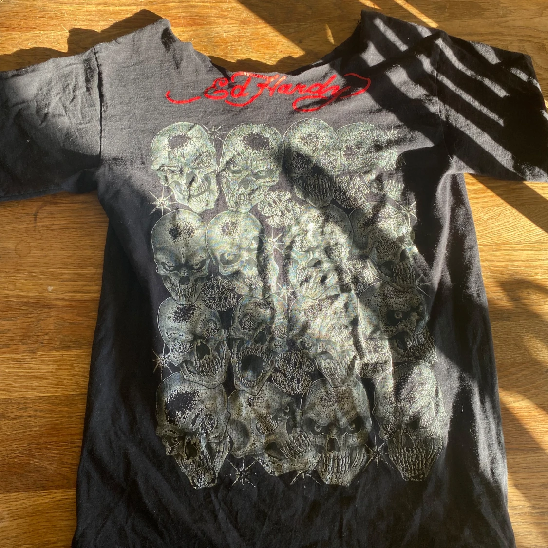 Cool svart t-shirt med ett stort tryck av flera dödskallar på framsidan. Sitter as bra och den är sne axlad eller va de heter