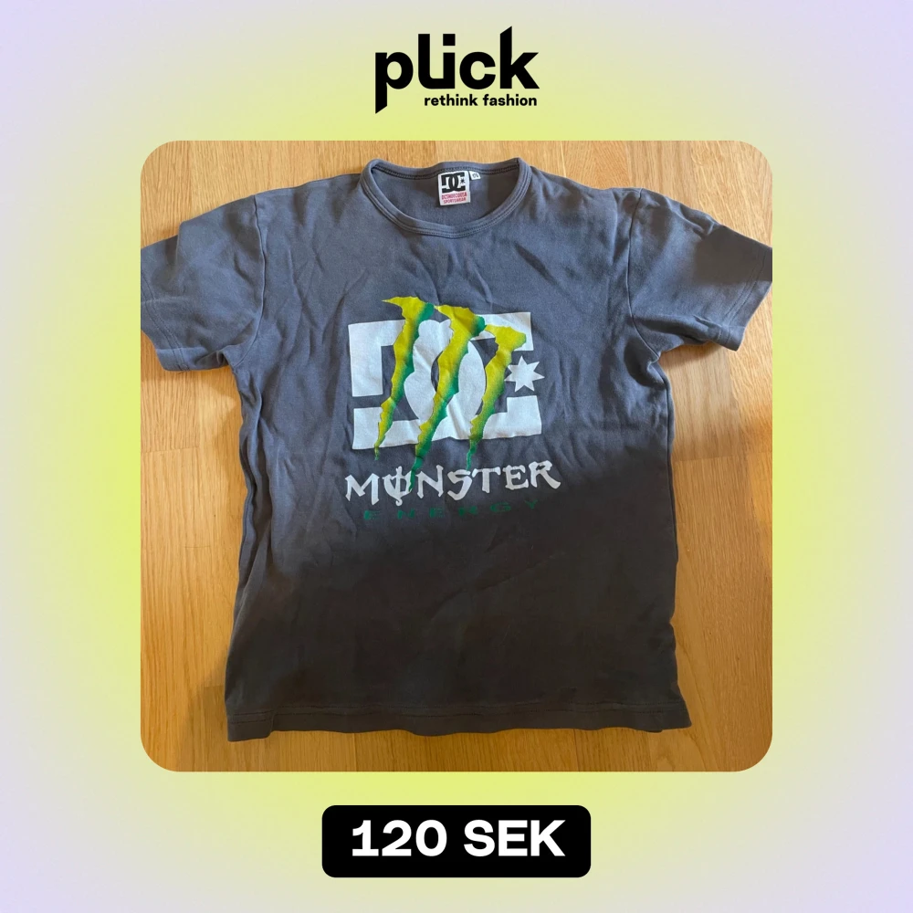 Säljer en grå t-shirt från DC Shoes med Monster Energy-logga i grönt och vitt på framsidan. Den är kortärmad och i bra skick, perfekt för vardagsbruk eller chill häng. Materialet känns mjukt och bekvämt. Passar bra till jeans eller shorts för en avslappnad stil! 💖