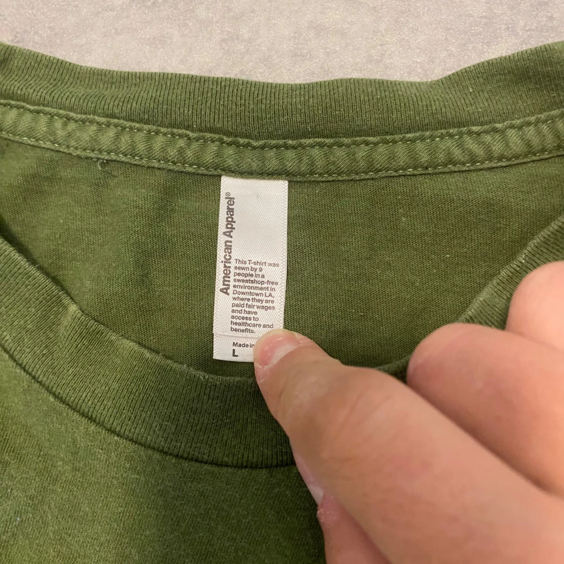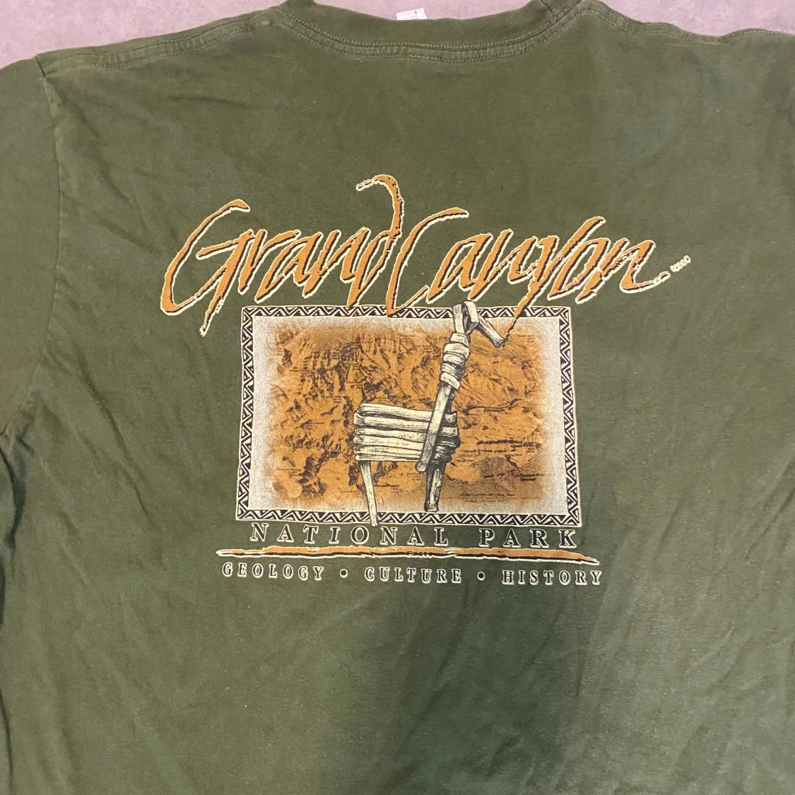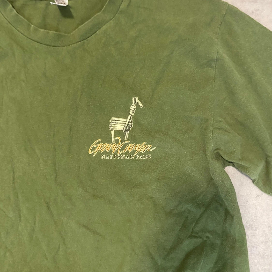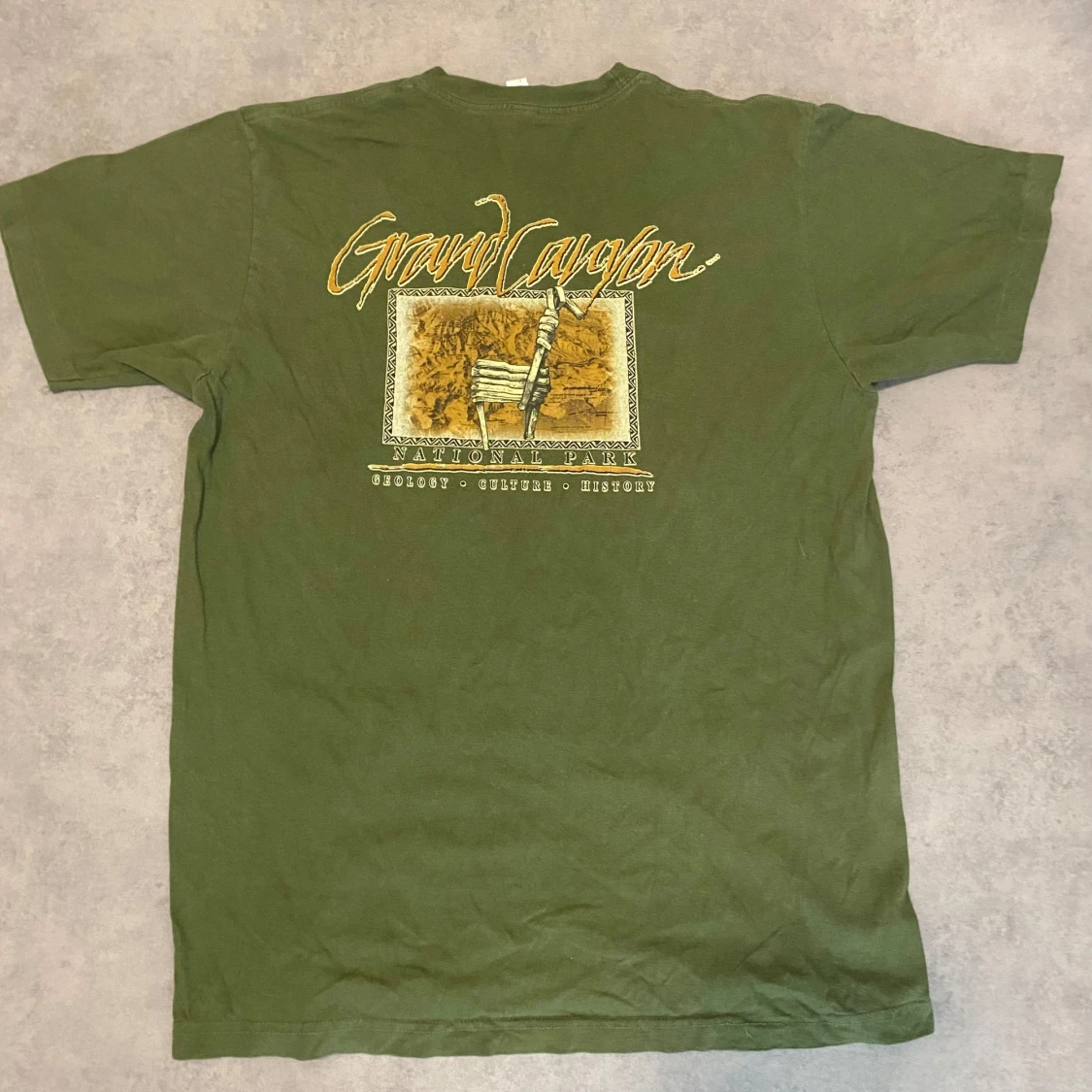 Snygg grön t-shirt från American Apparel med Grand Canyon National Park-tryck fram och bak. Klassisk passform, rund hals och korta ärmar. Tillverkad i mjuk bomull, perfekt för dig som gillar naturvibbar och coola tryck. Kolla gärna in profilen för liknande produkter och skriv vid minsta lilla fråga