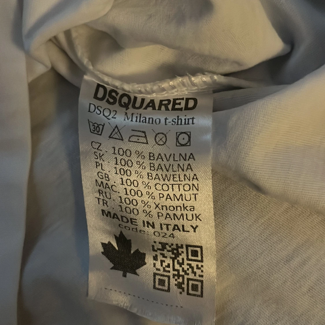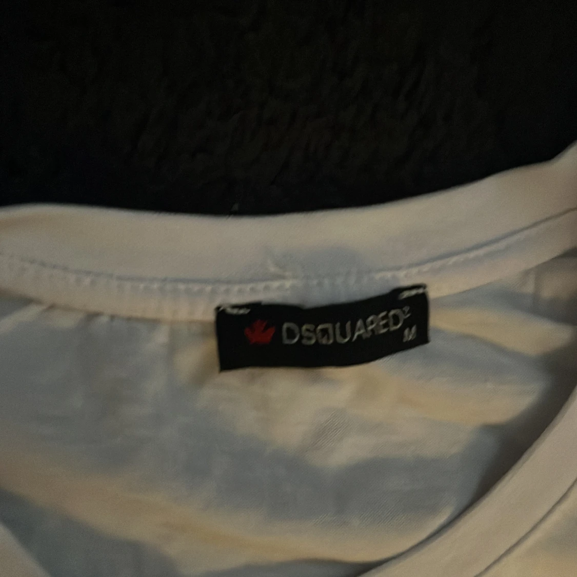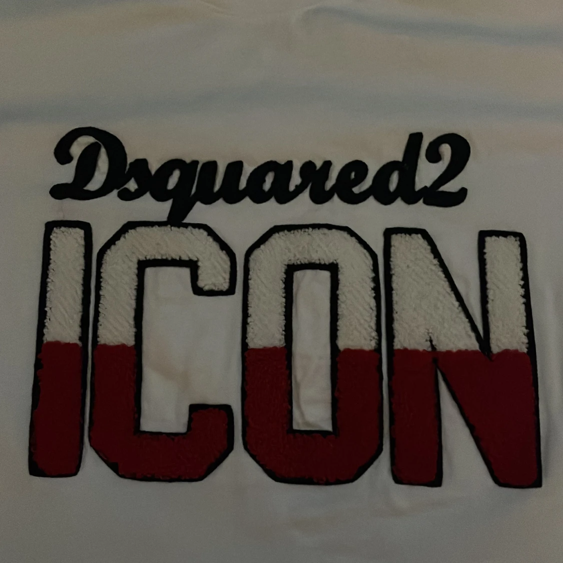 Vit t-shirt från Dsquared2 med stor, broderad 'ICON'-text i vitt och rött framtill. Klassisk passform med korta ärmar och rund hals. Tillverkad i 100% bomull för en skön känsla. Snygg kontrast mellan svart, vitt och rött i trycket. Saknar tag, helt ny aldrig använd