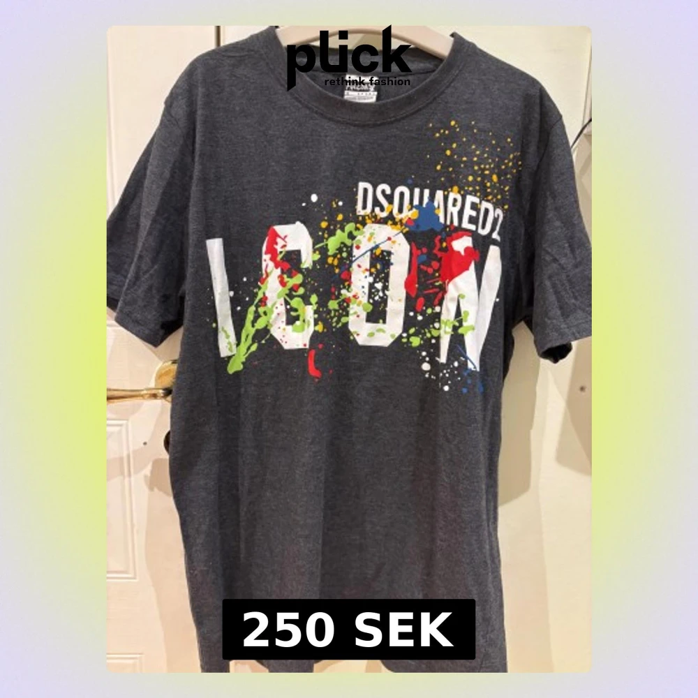 Snygg mörkgrå t-shirt från Dsquared2 med stor vit 'ICON'-text och färgstänk i rött, grönt, gult och blått framtill. Klassisk rund hals och korta ärmar. Perfekt statement-plagg för dig som gillar streetstyle.