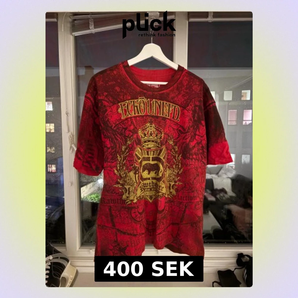 Säljer en fet röd t-shirt från Ecko Unltd i storlek Large. Den har ett stort, detaljerat guld- och svart tryck med krona, döskallar och logga både fram och bak. Materialet är 100% bomull och modellen är loose fit. Perfekt för dig som gillar drainer stilen