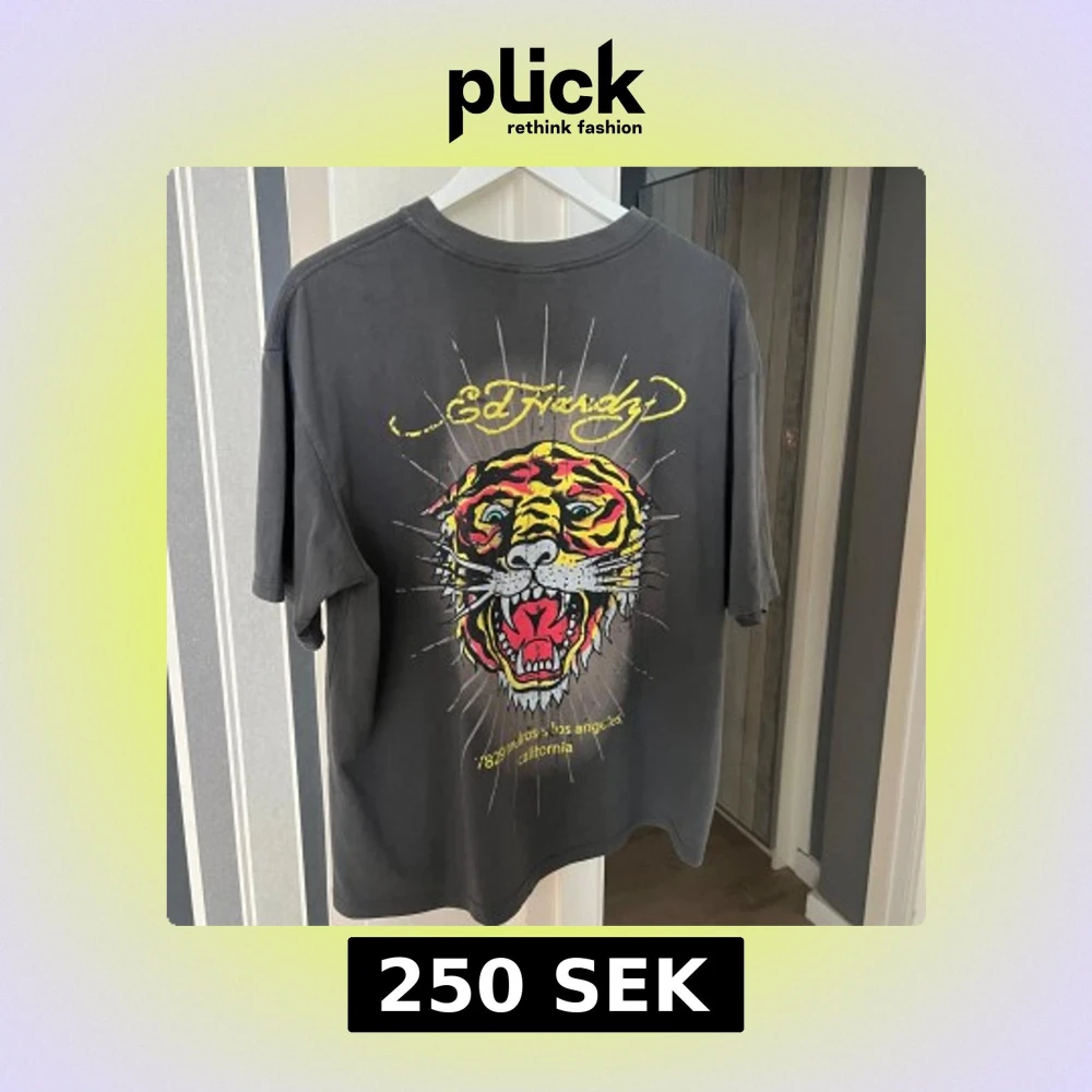 Säljer en grå t-shirt från Ed Hardy med ett coolt tigertryck på baksidan och gul text på framsidan. T-shirten har en oversized passform och korta ärmar. Perfekt för en casual look! Som ny i skick, endast testad och använd 1-2 gånger! Köpte för 600kr