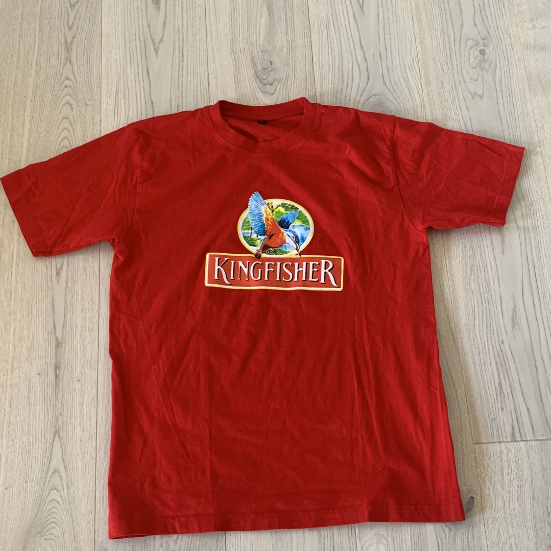 Röd tshirt med ölmärket kingfisher. Skick 9/10 Trycket är perfekt och inte crackat SIZE: L Inga fläckar eller liknande. Köpare betalar frakt. Köpare betalar frakt