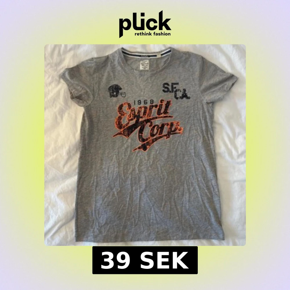 Snygg grå t-shirt från Esprit med coolt vintage-tryck i orange och svart på bröstet. Trycket har texten 'Esprit Corp', '1968' och 'SF CA' samt en amerikansk fotbollshjälm. T-shirten har rund hals och korta ärmar, perfekt för en avslappnad streetstil.