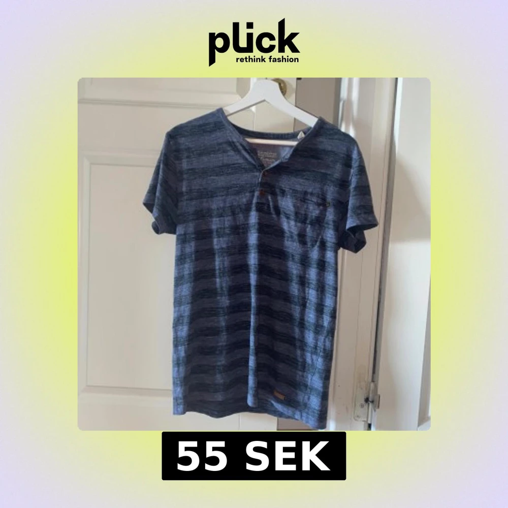 En blå t-shirt i storlek medium med knappar och bröstficka