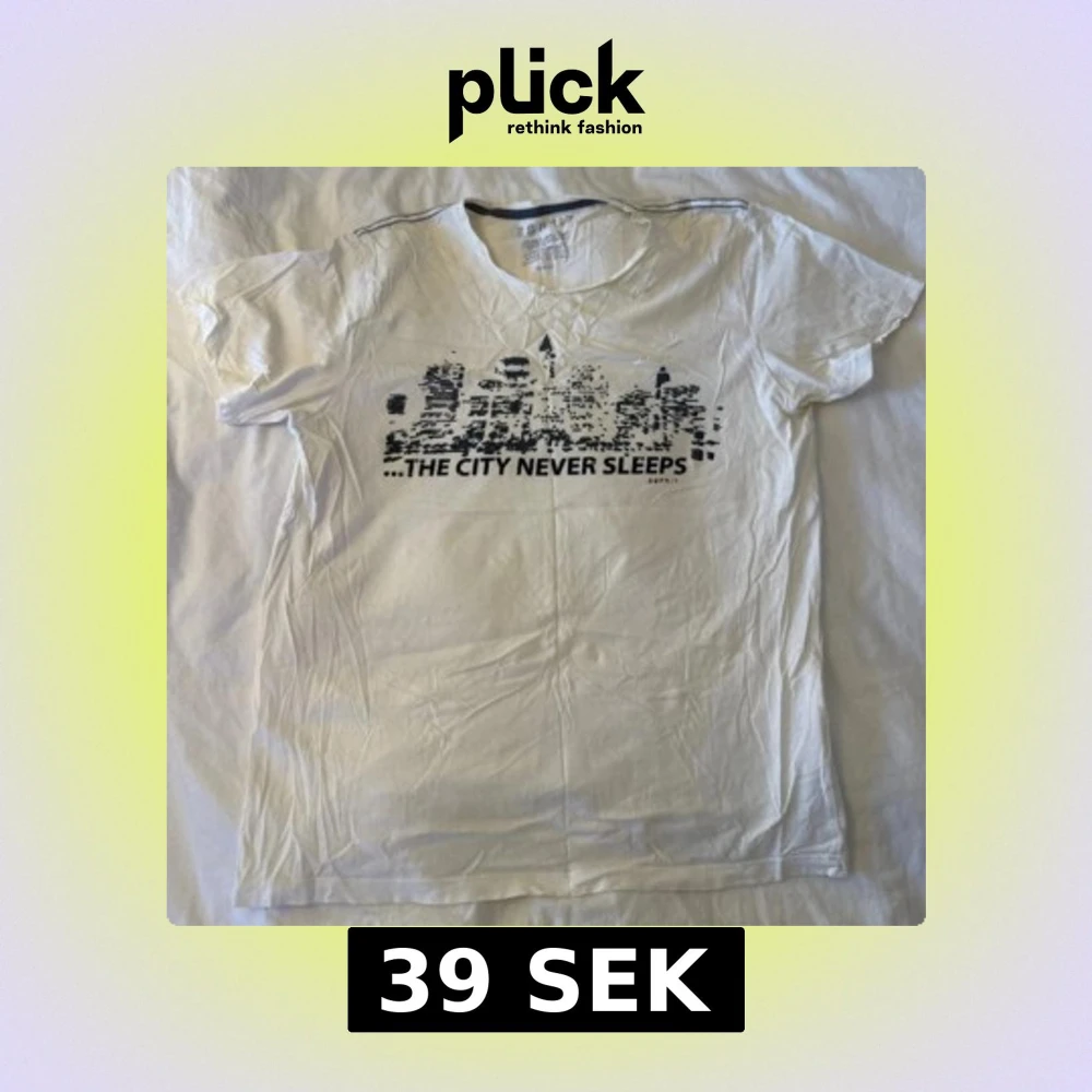 Vit t-shirt från Esprit med svart tryck av en stadssilhuett och texten 'THE CITY NEVER SLEEPS' på bröstet. Klassisk rund hals och korta ärmar. Perfekt för dig som gillar urban stil och grafiska prints.