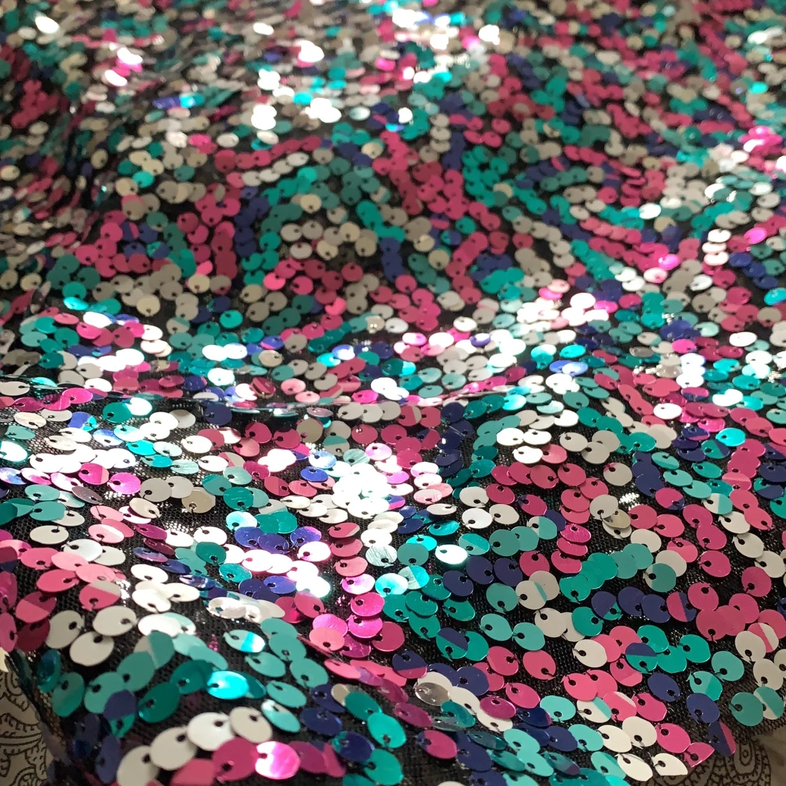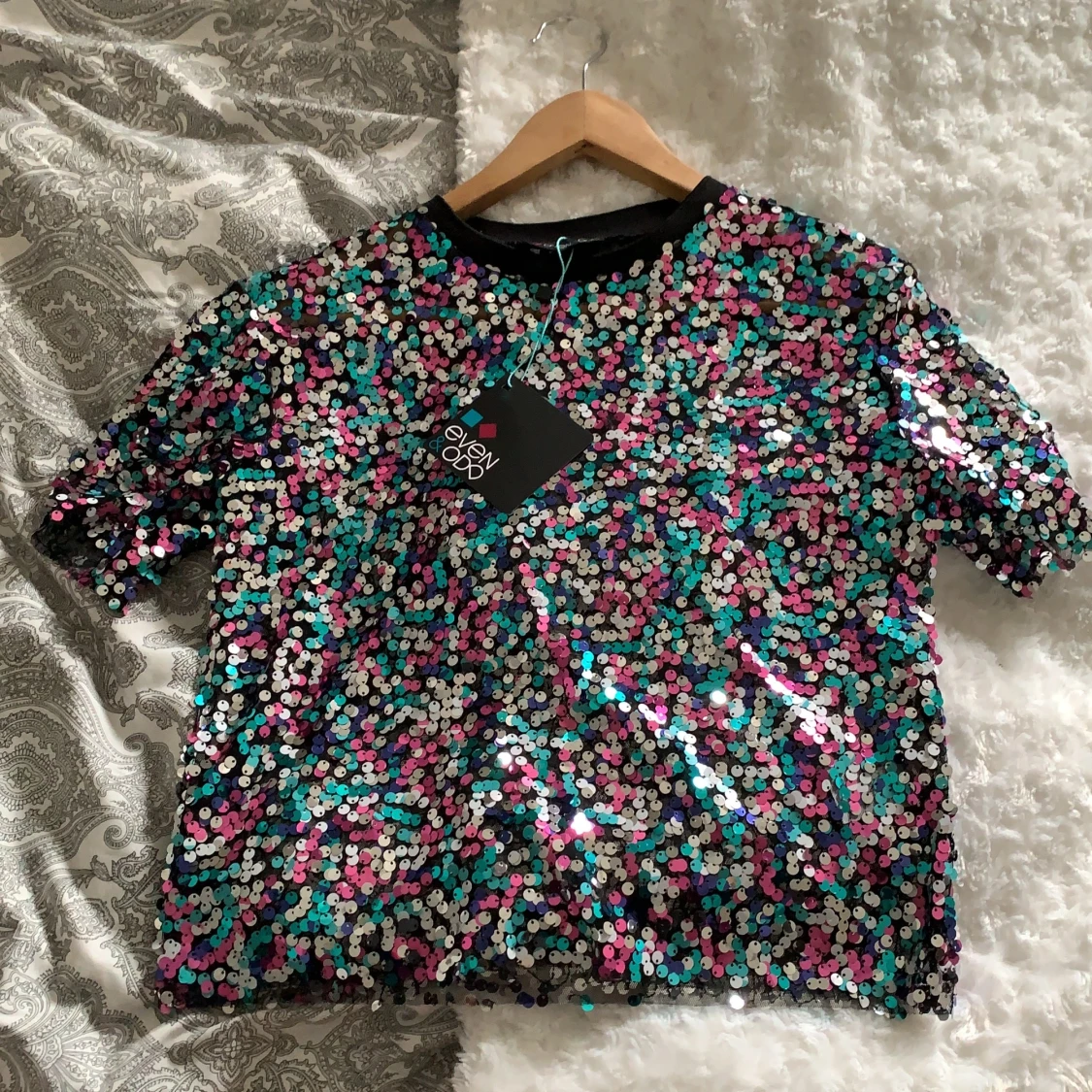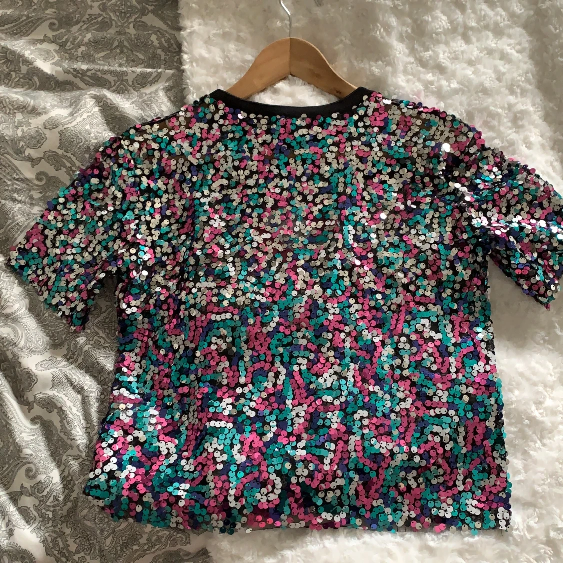 Detta är en T-shirt som är kladd i paljetter. Den är oanvänd, prislapp finns kvar. Den är ganska tunn i materialet.