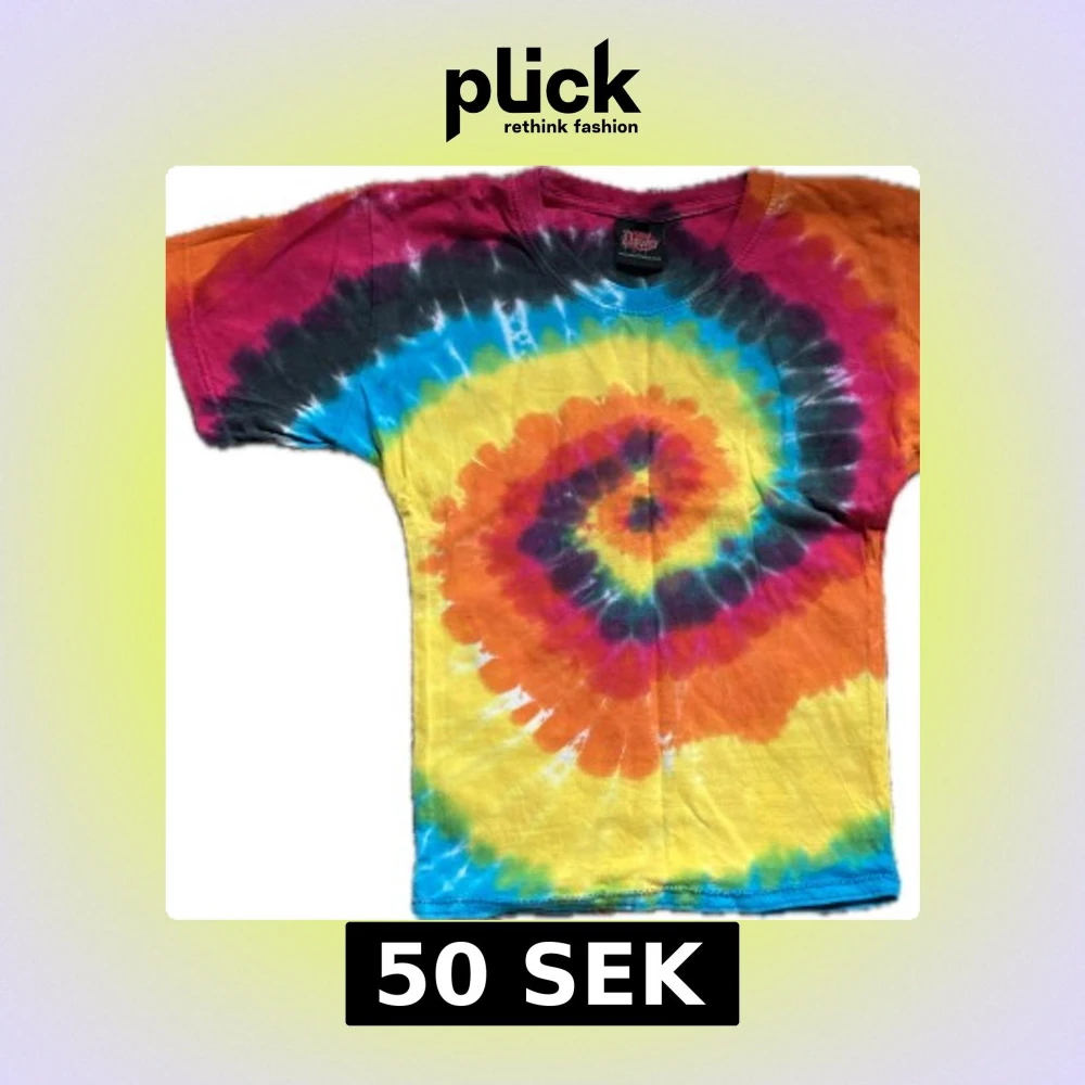 Säljer en färgglad tie-dye t-shirt från Darkwear UK. T-shirten har ett spiralmönster i regnbågs färger, inklusive blå, gul, orange och rosa. Den är kortärmad och tillverkad i bomull, insydd, snygg passform.