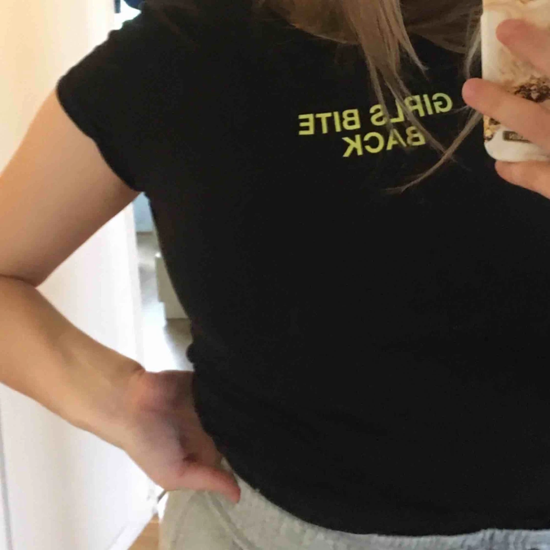 Svart snygg t-shirt från New Yoker. Väldigt bra skick. Texten är e neongrön och det står ”girls bite back”