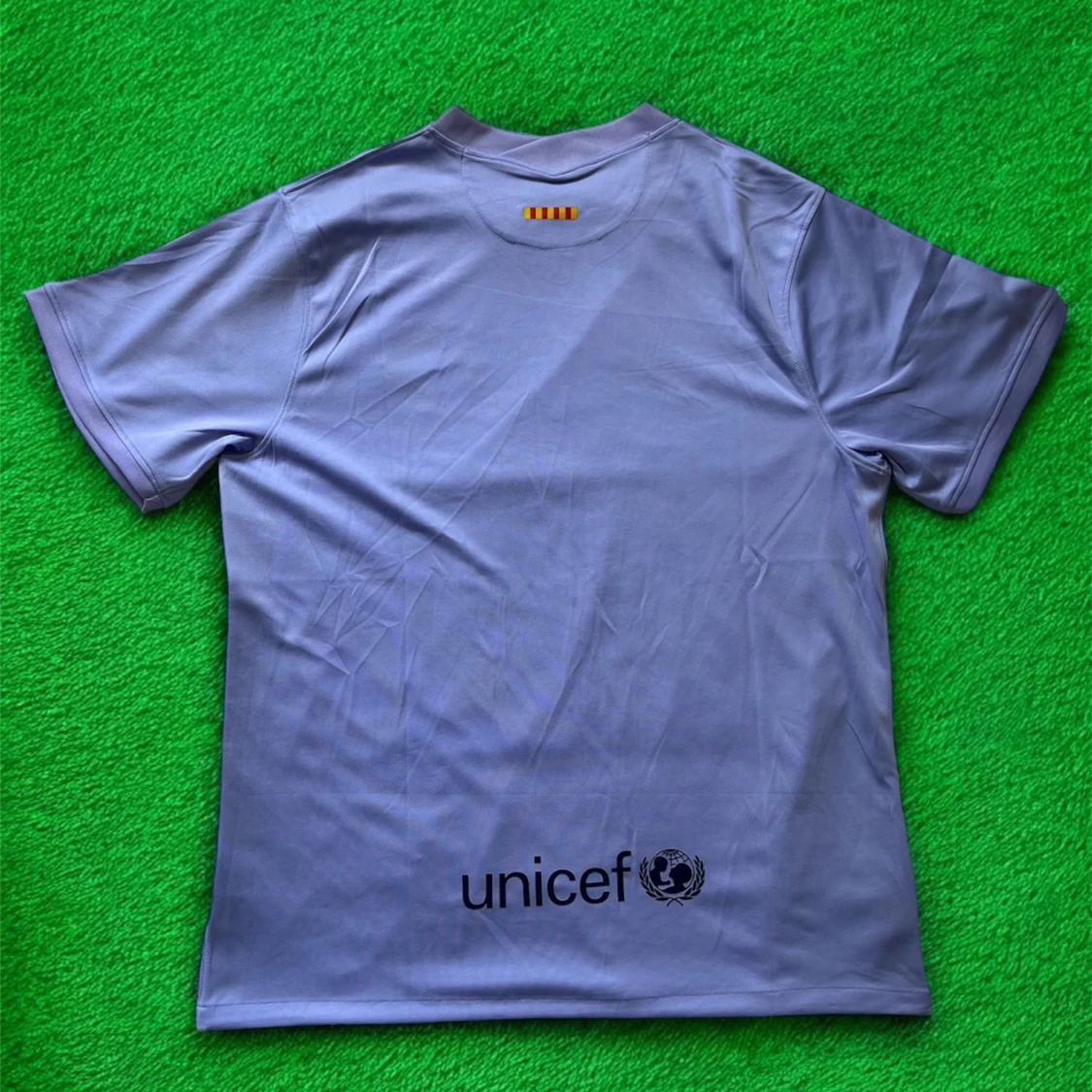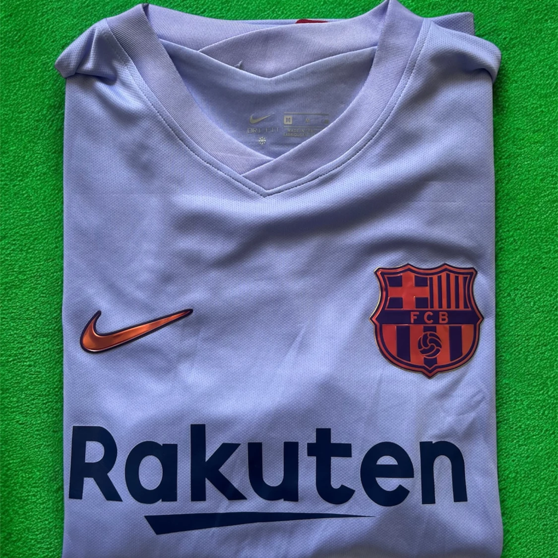Snygg FC Barcelona bortatröja från Nike i ljuslila polyester. Tröjan har korta ärmar, V-ringning och tryckta detaljer som klubbmärke, Nike-logga i kopparfärg och Rakuten-sponsor. Sidorna har blå och röda ränder, och Unicef-logga finns på ryggen.