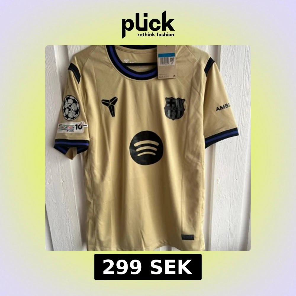 Snygg FC Barcelona bortatröja i champagnefärg med svarta detaljer, tryckta loggor och sponsortryck från Spotify. Kortärmad modell med blå och svarta ränder på ärmslut och krage. Namn och nummer Roony 28 på ryggen. Tillverkad i lätt och ventilerande polyester.