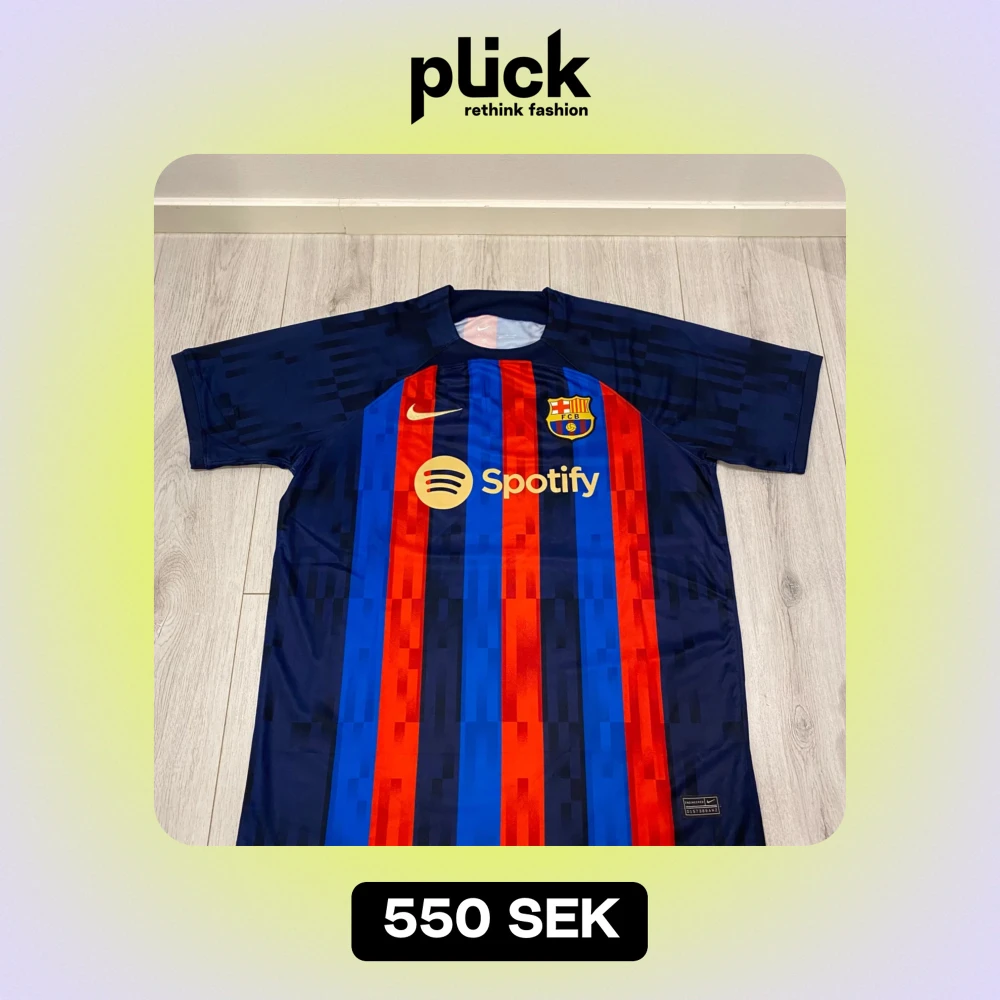 Säljer en FC Barcelona fotbollströja i nyskick. Den är kortärmad och har de klassiska ränderna i rött och blått. Tröjan har sponsorloggor från Spotify och UNHCR. Perfekt för alla Barca-fans! 💙❤️