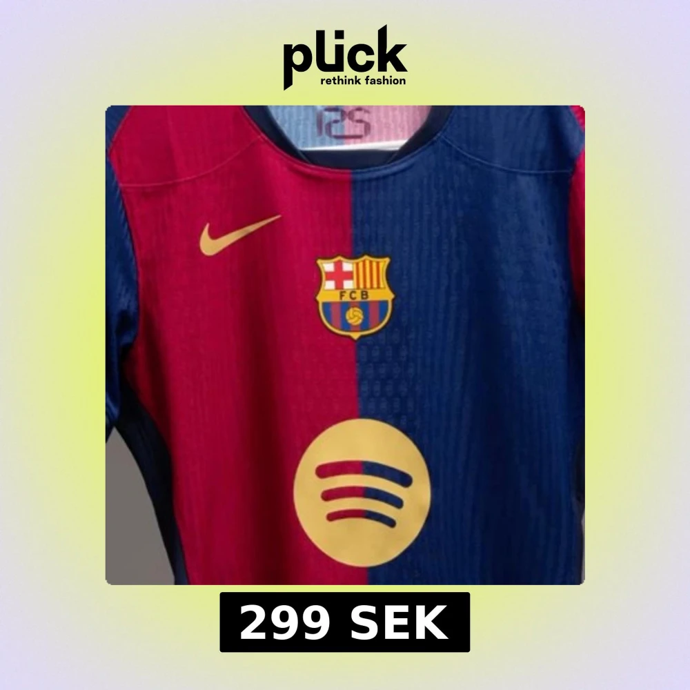Alla storlekar finns Säljer en FC Barcelona fotbollströja i klassiska rödblå färger med gul Nike-logga och Spotify som sponsor. Tröjan har klubbmärket på bröstet och är kortärmad. Perfekt för dig som älskar Barca!