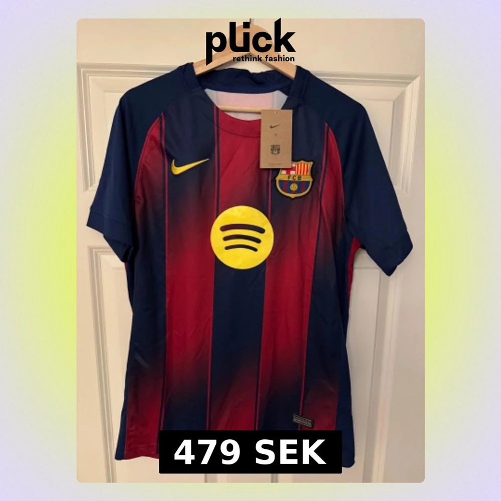 Säljer en FC Barcelona-matchtröja med Lamine Yamal #10. Kortärmad med klassiska blå/röda ränder, gult Nike-märke och Spotify-logga. Lätt polyester, perfekt för träning eller häng. Följ oss gärna på Instagram: @kickstoreuf.