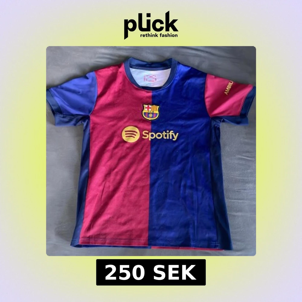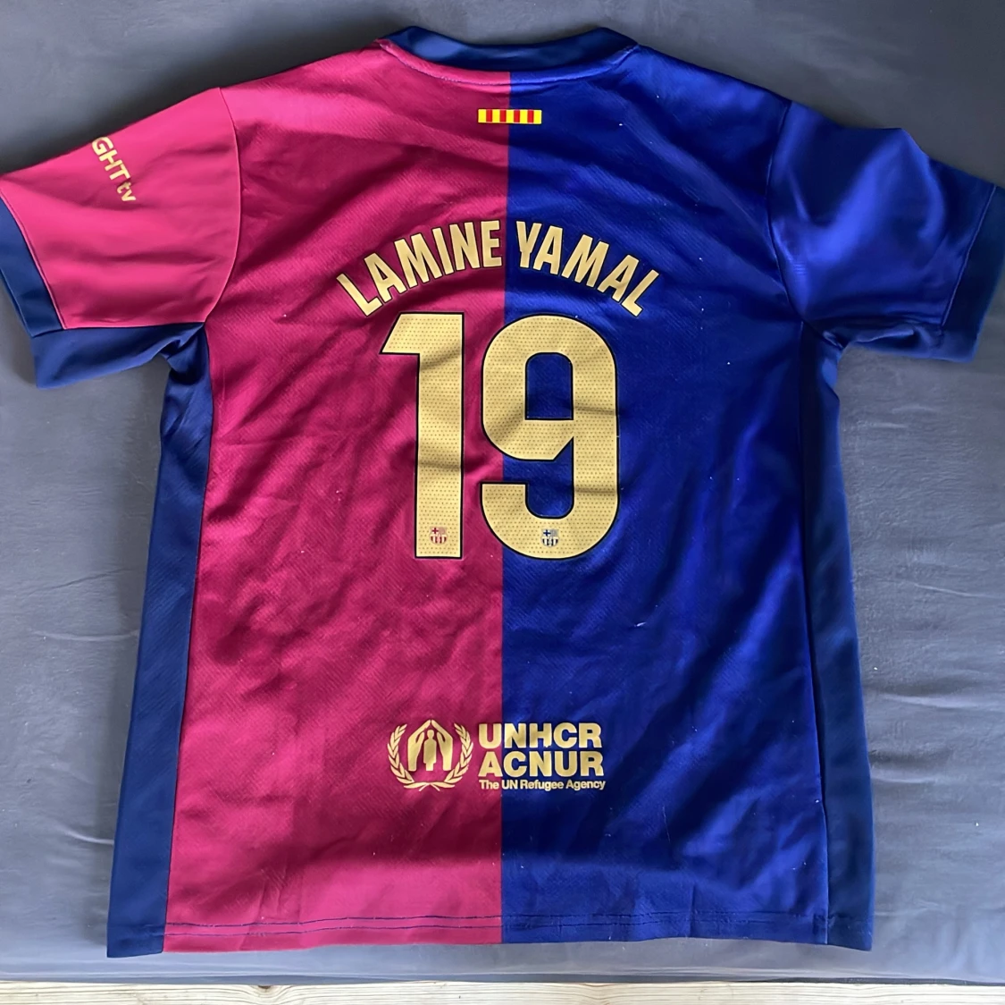 Snygg FC Barcelona fotbollströja med Lamine Yamal 19-tryck. Tröjan har klassisk halva-röd halva-blå design, guldiga detaljer och klubbmärke på bröstet. Korta ärmar och tillverkad i lätt, ventilerande material. Perfekt för dig som älskar Barca och vill sticka ut på planen.