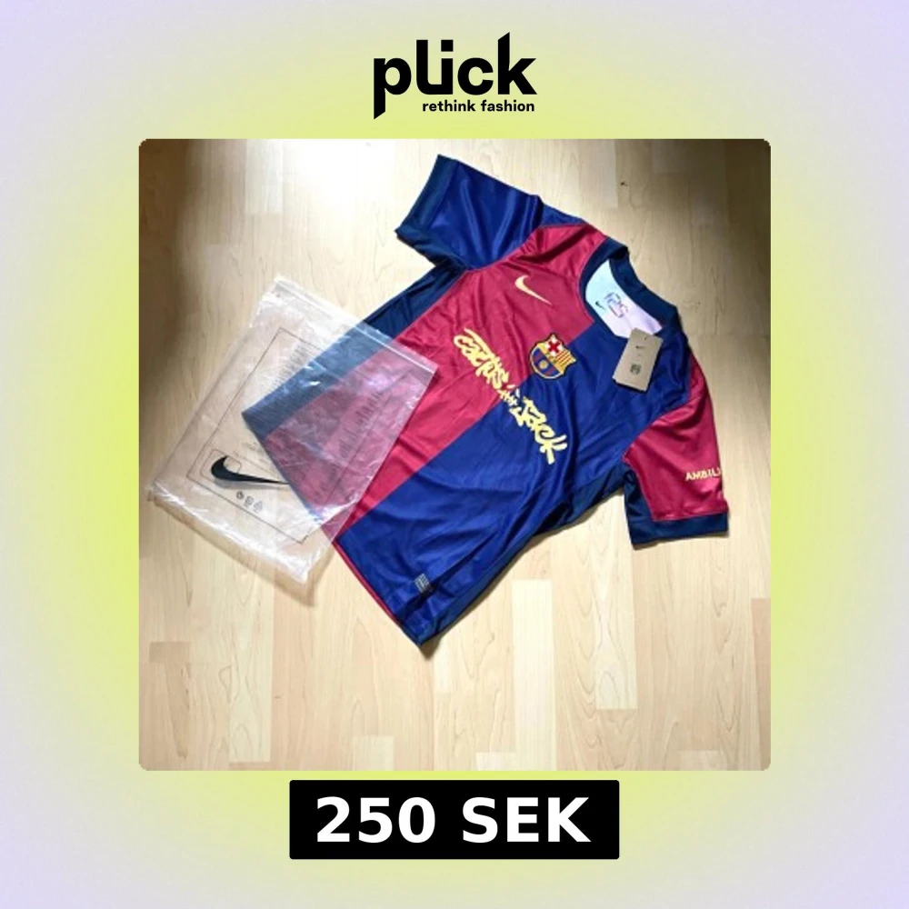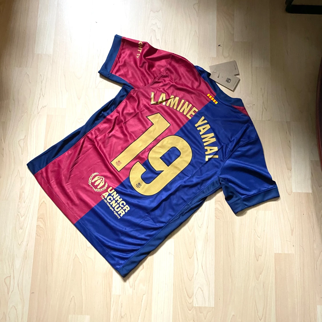 Säljer en officiell FC Barcelona matchtröja från Nike med Lamine Yamal och nummer 19 på ryggen. Tröjan är kortärmad, har klassiska blå och röda paneler, guldiga detaljer och klubbmärke på bröstet.
