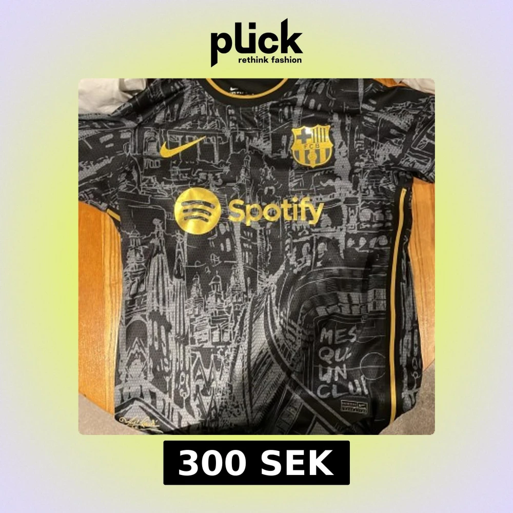 Snygg FC Barcelona fotbollströja med Lamine Yamal och nummer 19 på ryggen. Svart bas med guldiga detaljer, klubbmärke och sponsortryck. Unikt grafiskt mönster inspirerat av Barcelonas stadssilhuett. Tillverkad i Nike Dri-FIT material för bästa komfort.