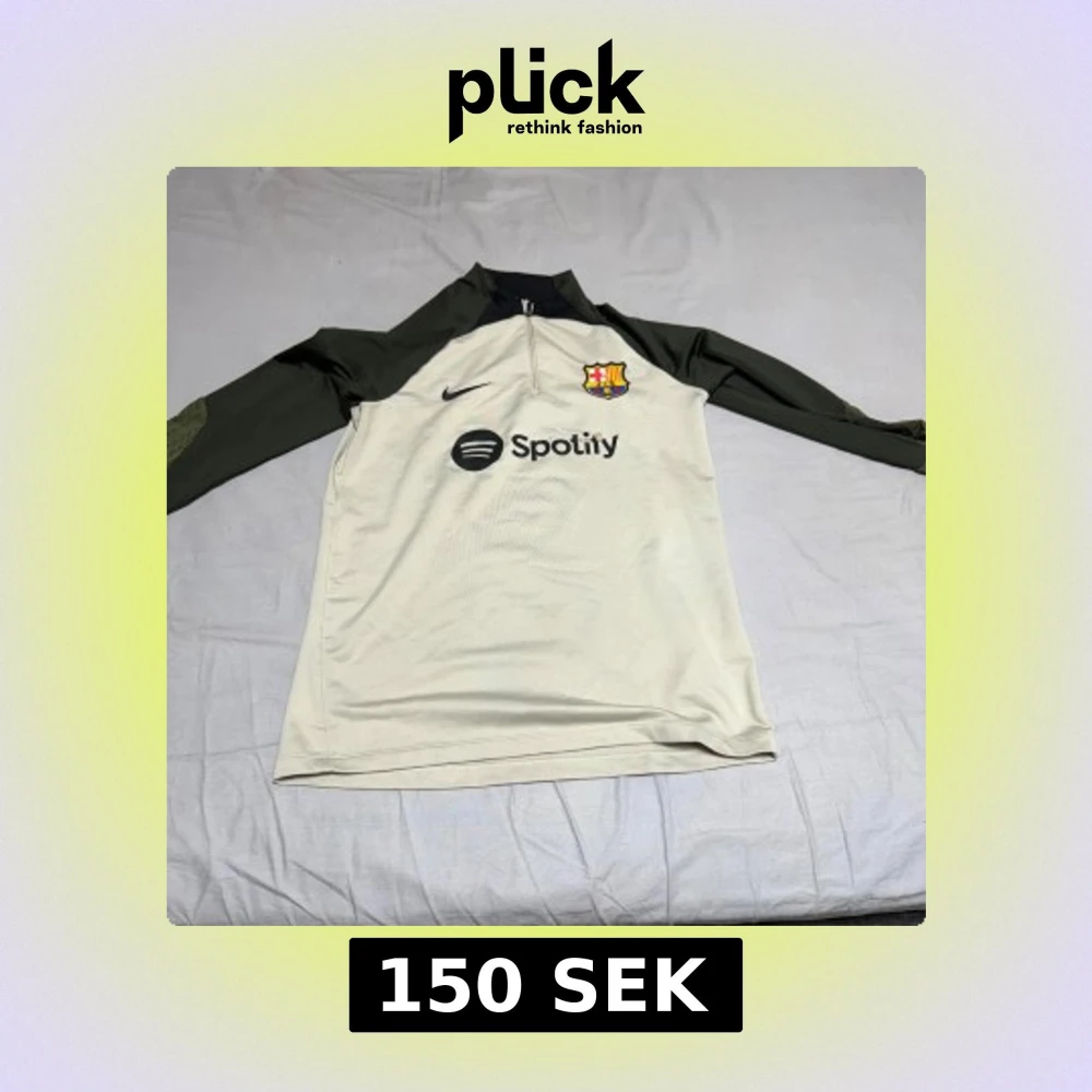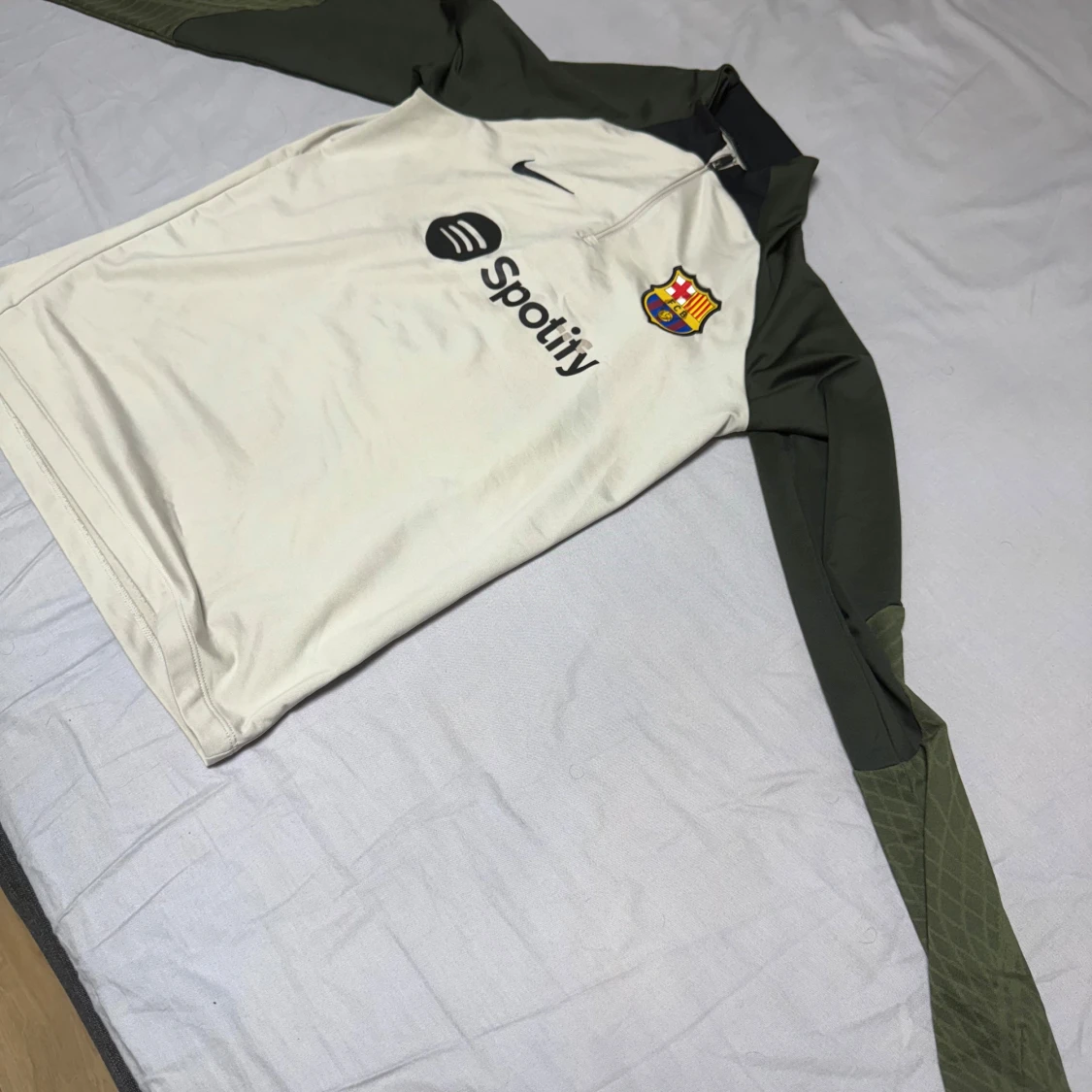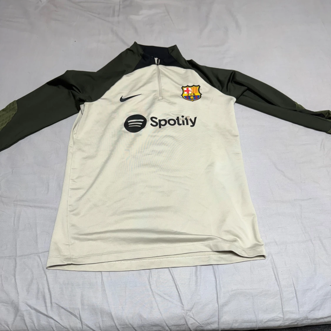 Snygg långärmad träningströja från FC Barcelona med klubbmärke och Spotify-logga på bröstet. Tröjan är beige med mörkgröna ärmar och har halv dragkedja vid halsen. Tillverkad i lätt och funktionellt material, perfekt för fotbollsträning.