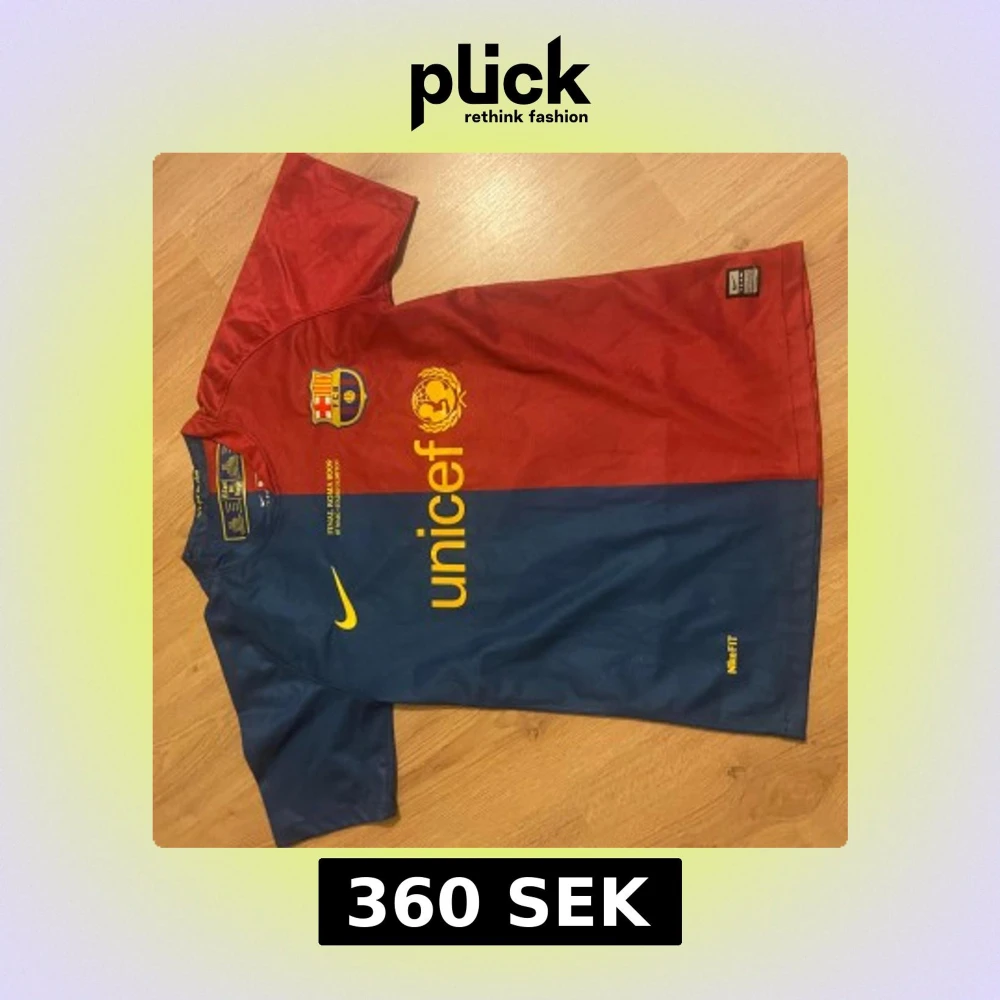 Säljer en ikonisk FC Barcelona fotbollströja från Nike med Messi 10 på ryggen. Tröjan har klassiska röda och mörkblå paneler, gula detaljer och klubbmärke på bröstet. Materialet är lätt och andas, perfekt för match eller träning. UNICEF-logga och finaldetaljer från 2009.