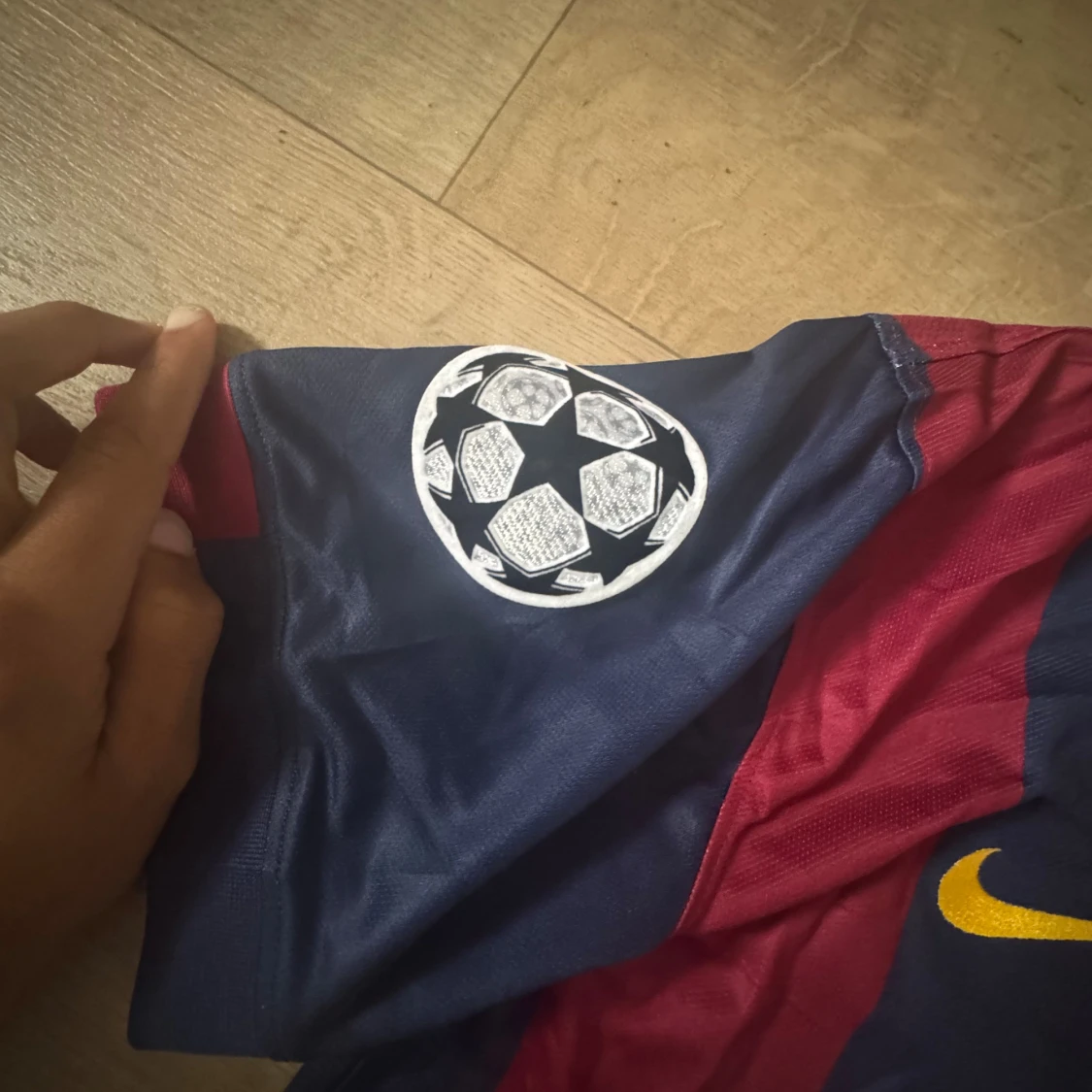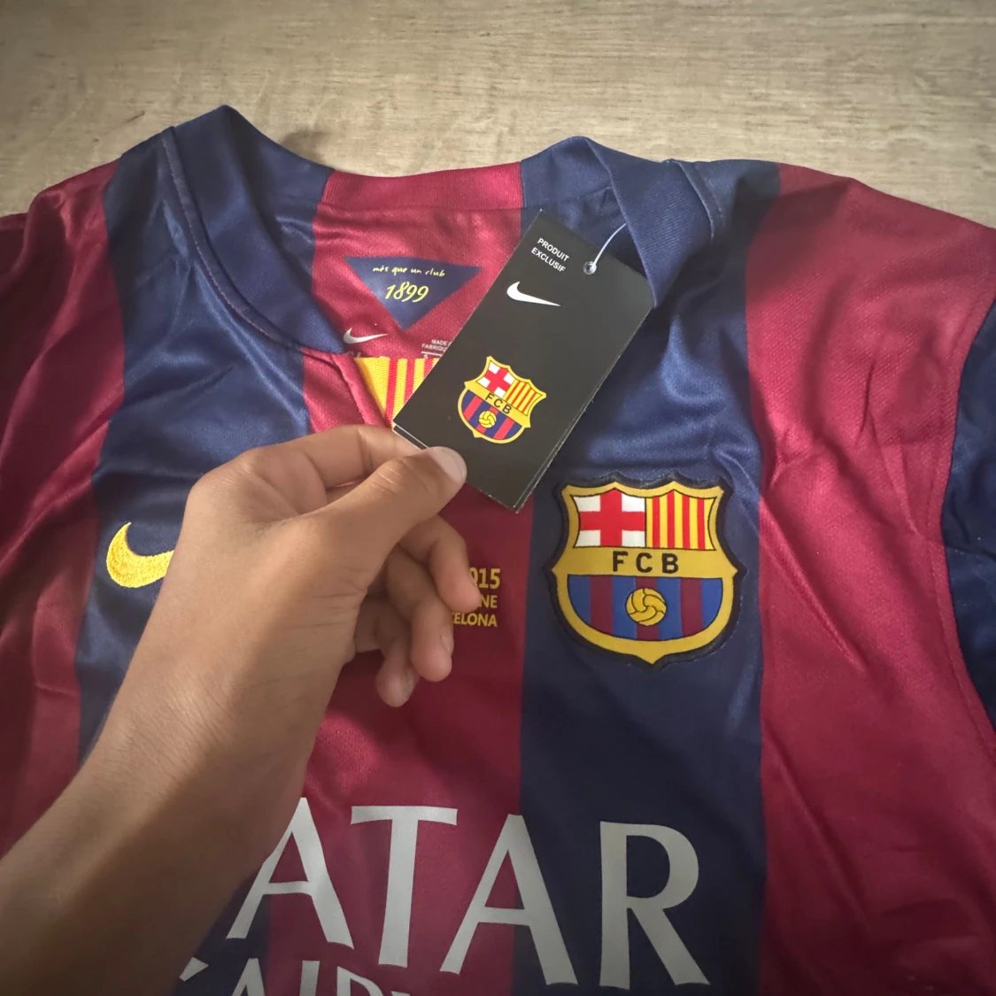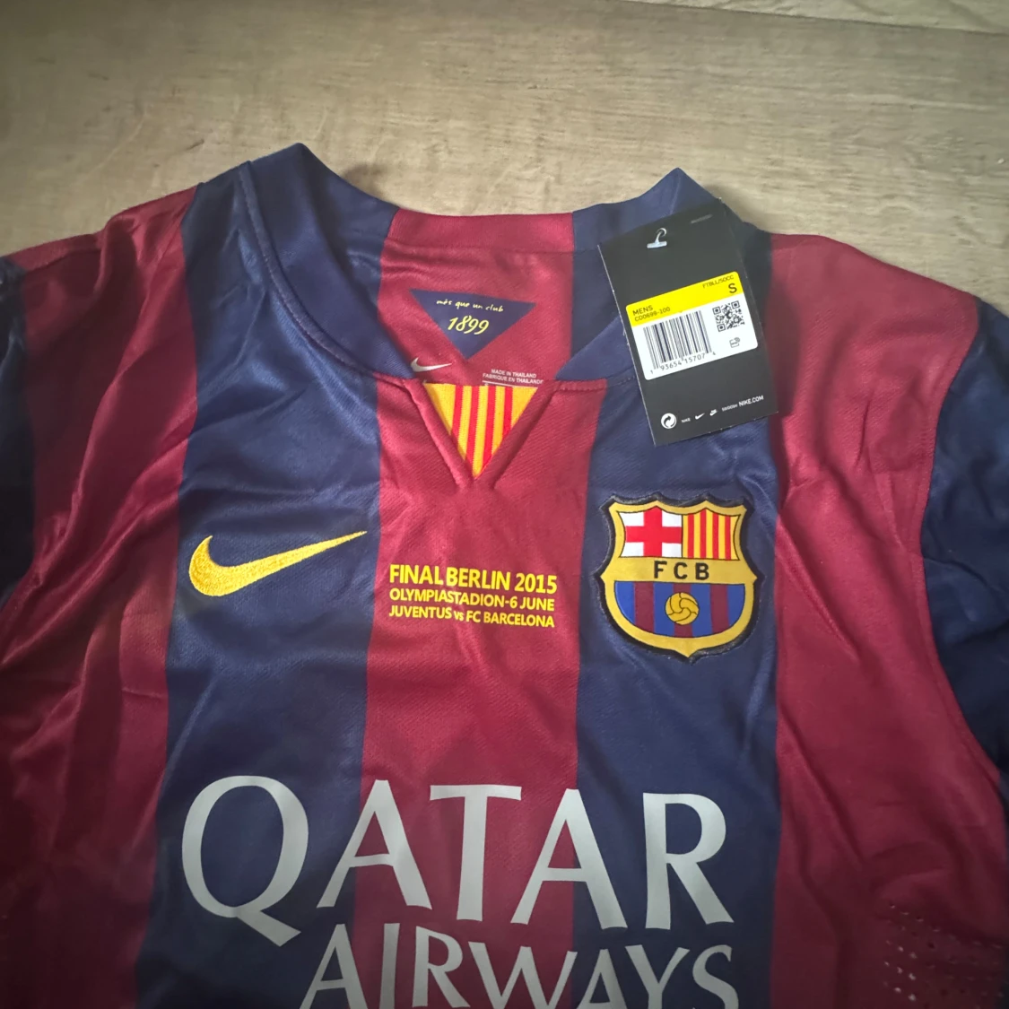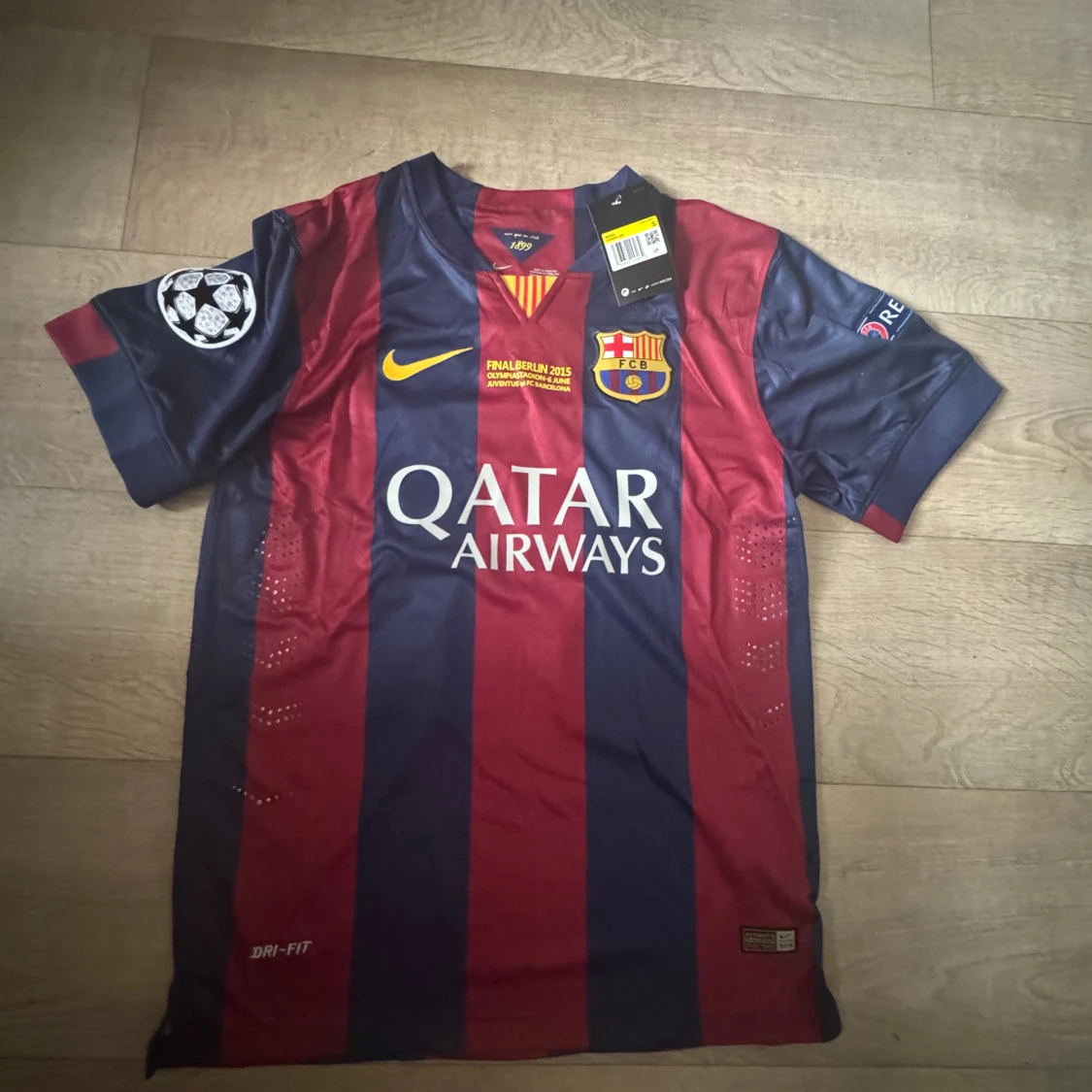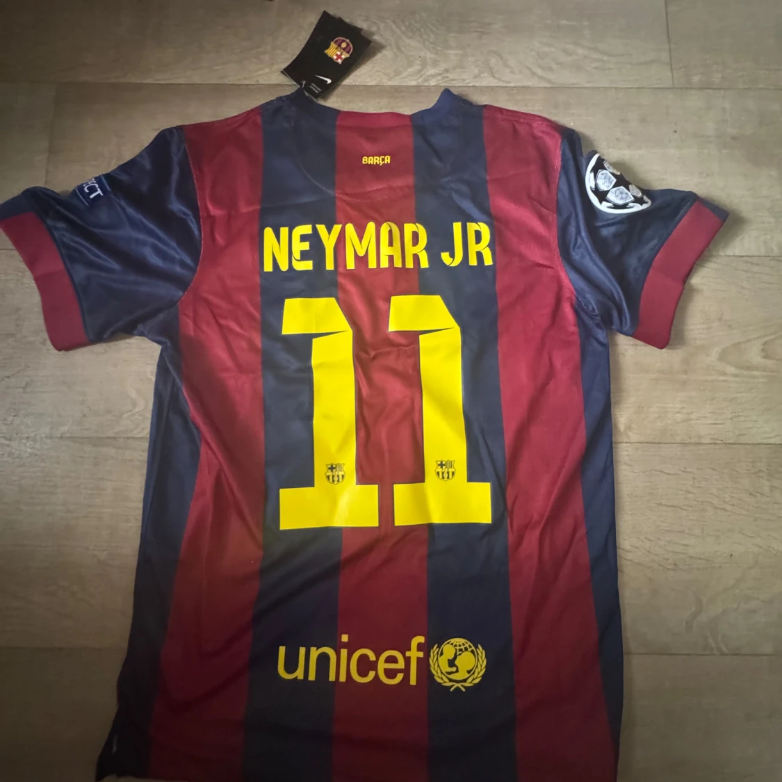 Säljer en officiell FC Barcelona matchtröja från Champions League-finalen 2015 med Neymar Jr och nummer 11 på ryggen. Tröjan är randig i mörkblått och rött, har korta ärmar, broderat klubbmärke och Nike-logga, samt tryckta sponsorer. Materialet är lätt polyester med Dri-FIT-teknologi.