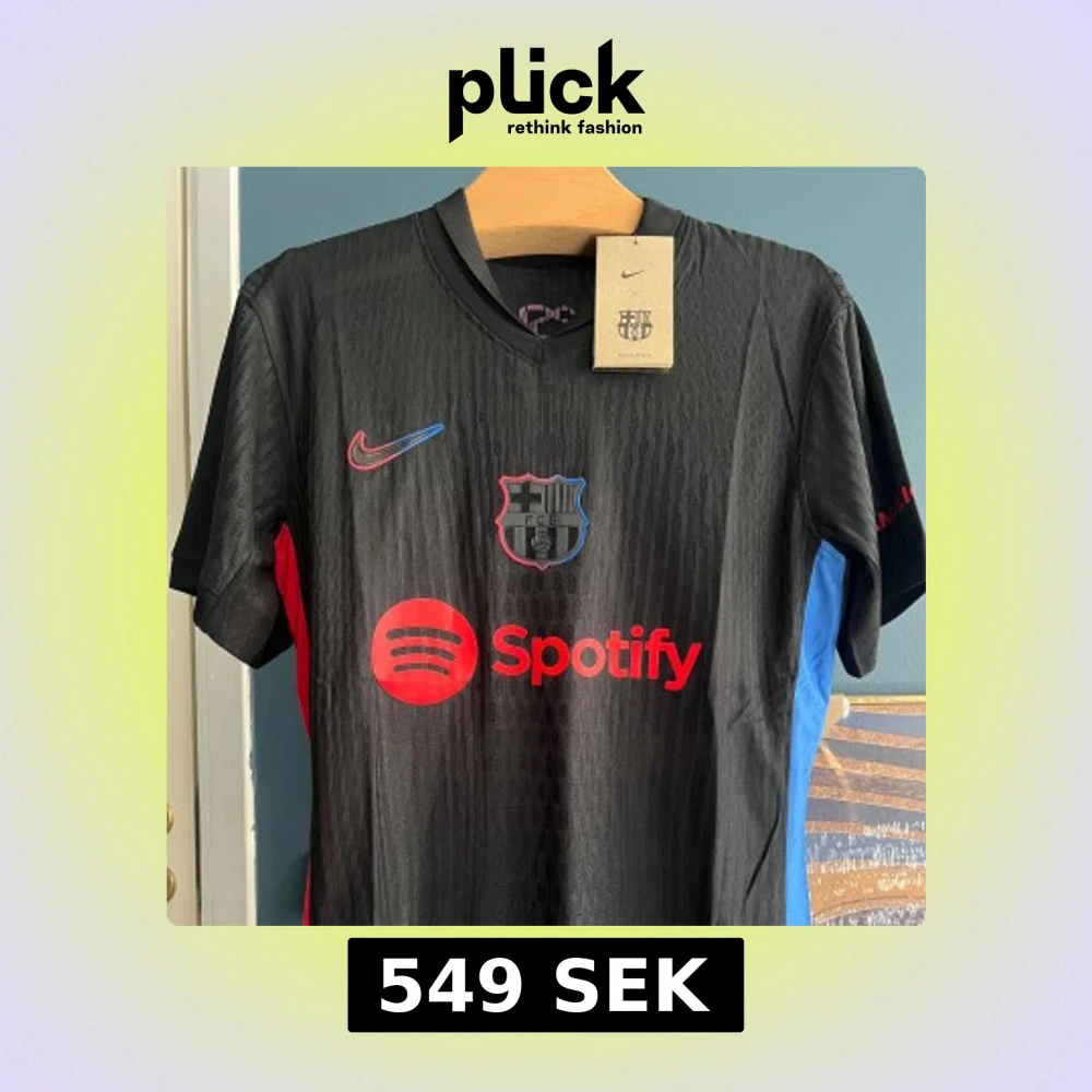 Säljer en svart FC Barcelona fotbollströja från Nike med röd Spotify-logga på bröstet och UNHCR-tryck på ryggen. Tröjan har korta ärmar, subtilt mönster i tyget och detaljer i blått och rött på sidorna. Materialet är lätt och andas, perfekt för match eller träning.
