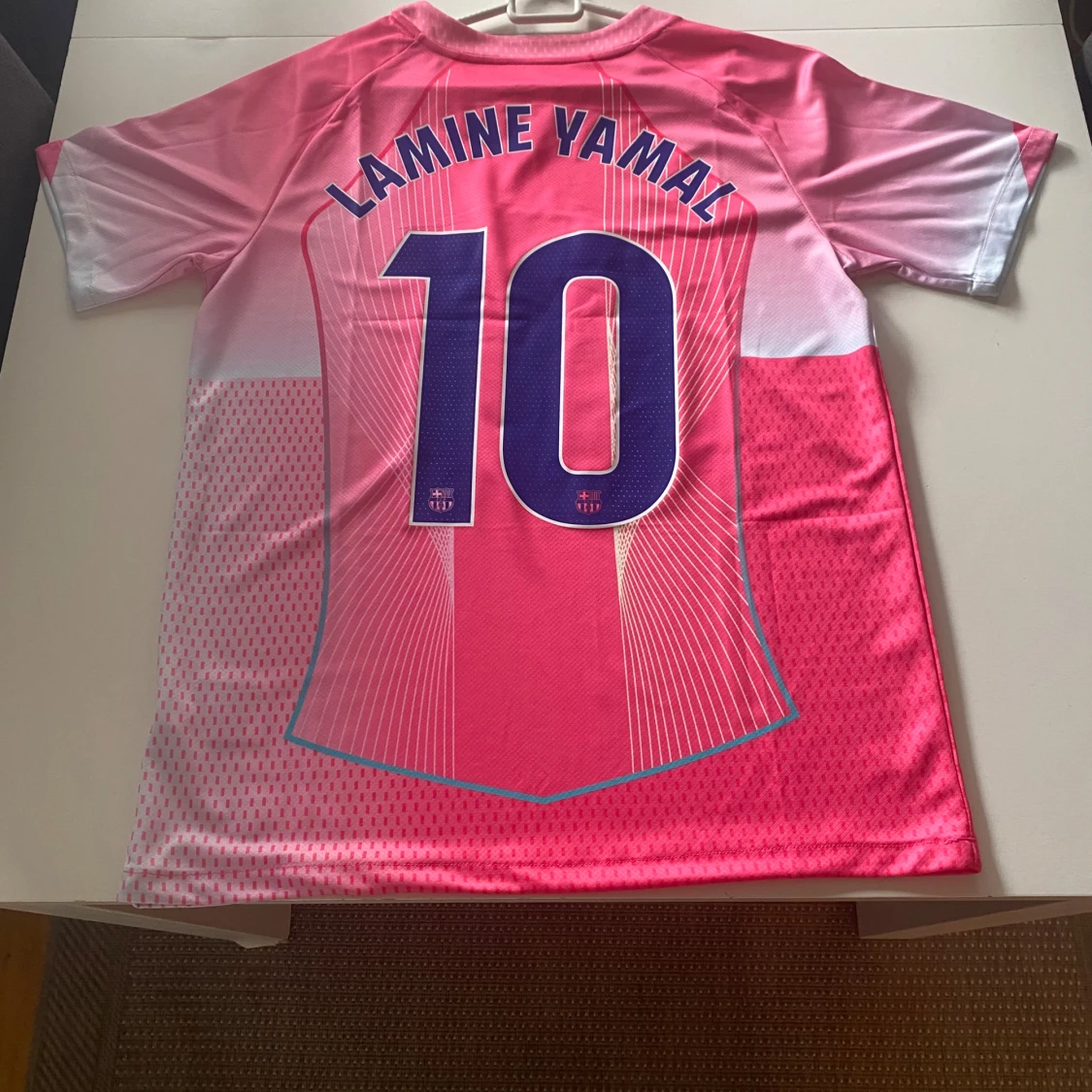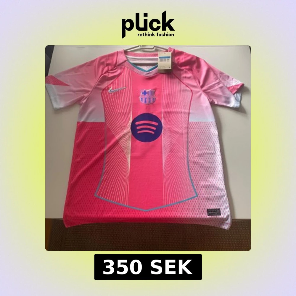 Snygg FC Barcelona fotbollströja i rosa och lila med Spotify-logga på bröstet och Lamine Yamal 10 på ryggen. Tröjan har korta ärmar, klubbmärke på bröstet och är tillverkad i lätt, ventilerande material. Perfekt för dig som vill sticka ut på planen.