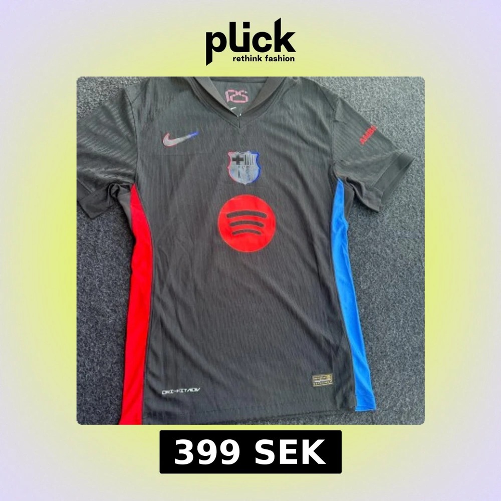 Säljer en svart FC Barcelona bortatröja från säsongen 2024/25 med röda och blå detaljer på sidorna. Tröjan har korta ärmar, klubbmärke på bröstet, Spotify-logga och tryck med nummer 19 och LAMINE YAMAL på ryggen.