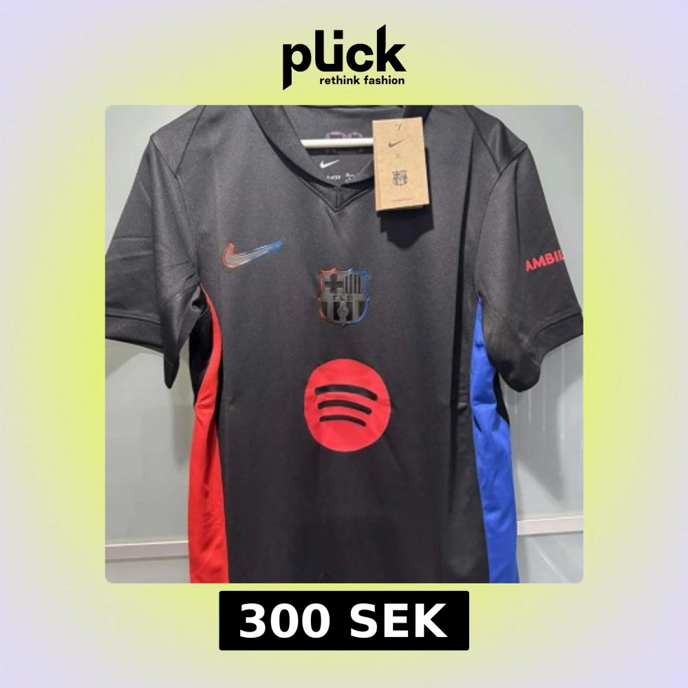 Säljer en svart FC Barcelona fotbollströja från Nike med klubbmärke och sponsorlogga på bröstet. Tröjan har röda och blå detaljer på sidorna, korta ärmar och tryckt text på ärmen. Perfekt för dig som älskar Barca! Finns alla storlekar