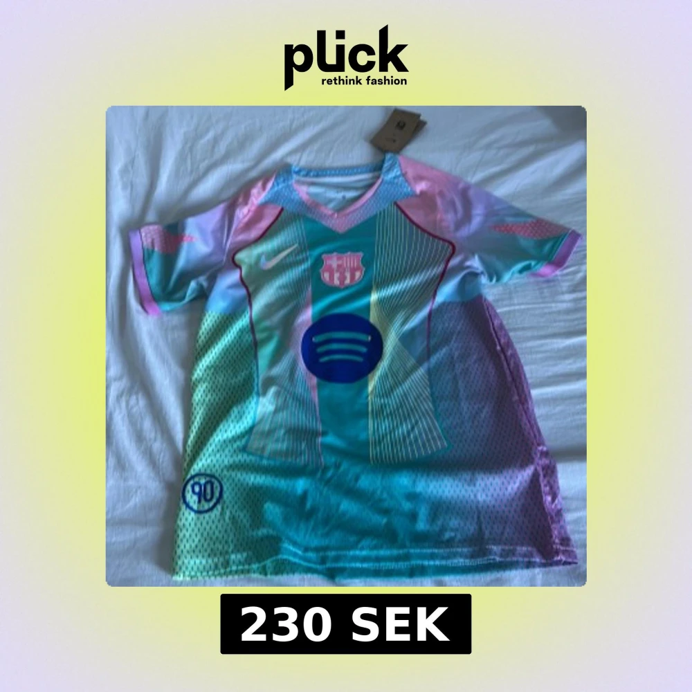 Säljer en limited edition FC Barcelona x Nike fotbollströja i Dri-FIT material. Tröjan har korta ärmar och ett unikt mönster i turkos, rosa, blått och lila med tunna ränder och prickar. Barcelona-logga och Nike Swoosh på bröstet samt Spotify-logga. Perfekt för dig som vill sticka ut på planen.