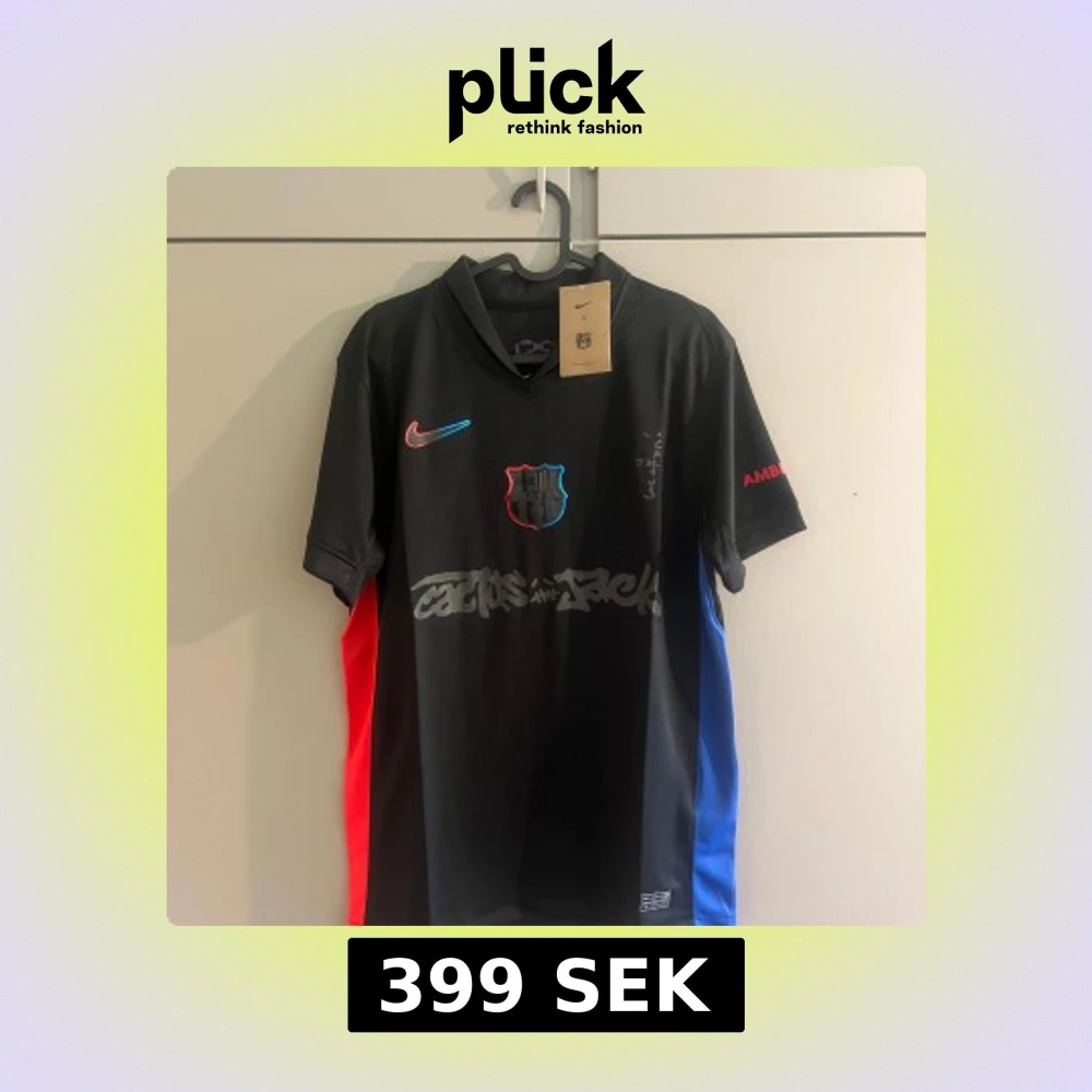 Snygg svart FC Barcelona fotbollströja från Nike med klubbmärke i neonfärger, röd Nike-logga och grafiskt tryck på bröstet. Sidorna har röda och blå paneler, och ärmen har Ambilight-tryck. Tillverkad i lätt och ventilerande polyester.