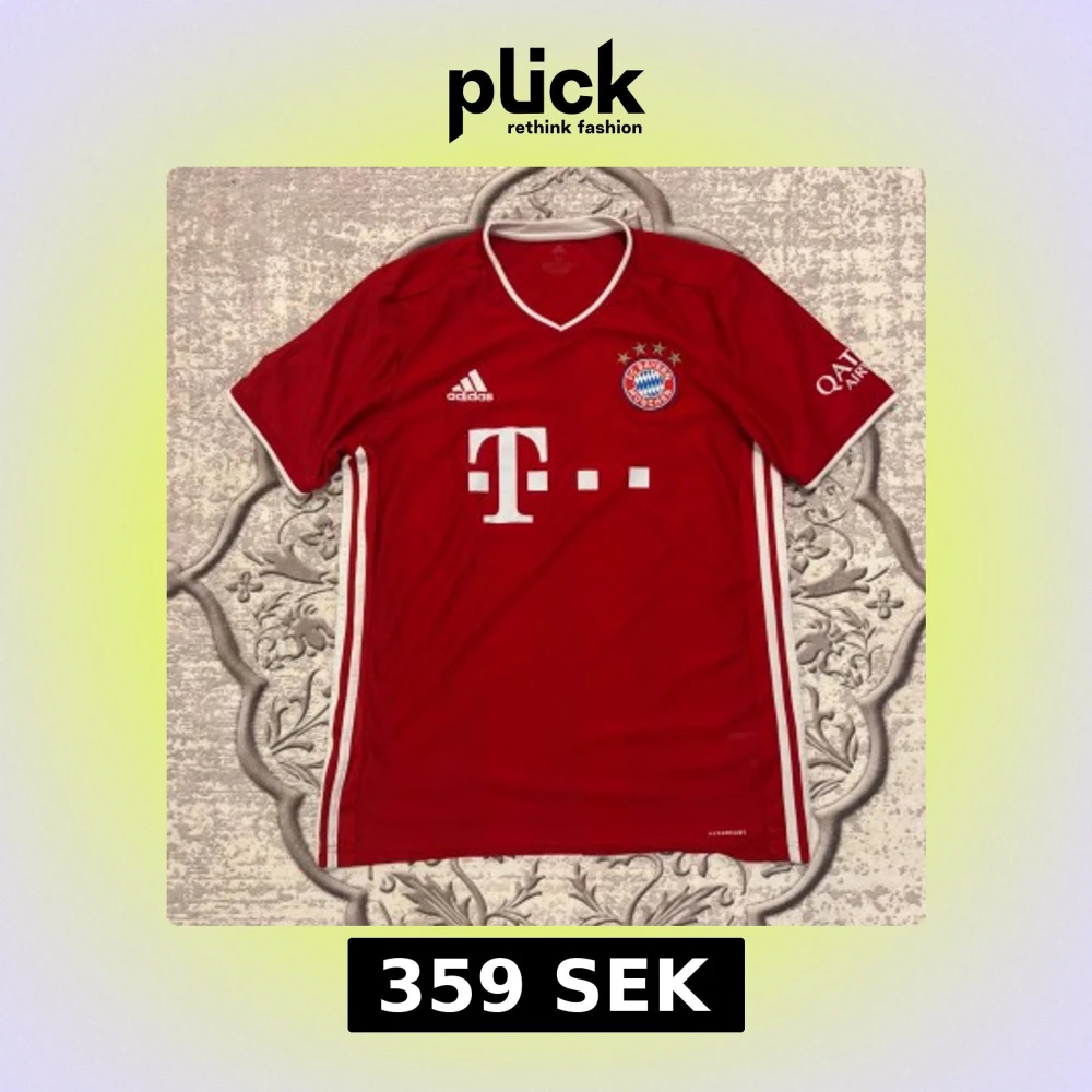 Röd FC Bayern München fotbollströja från Adidas med vita detaljer och klubbmärke på bröstet. Klassisk V-ringning, korta ärmar och AEROREADY-material som andas. Tysklands mästarlag, tryck på ryggen och sponsordetaljer på ärmen.