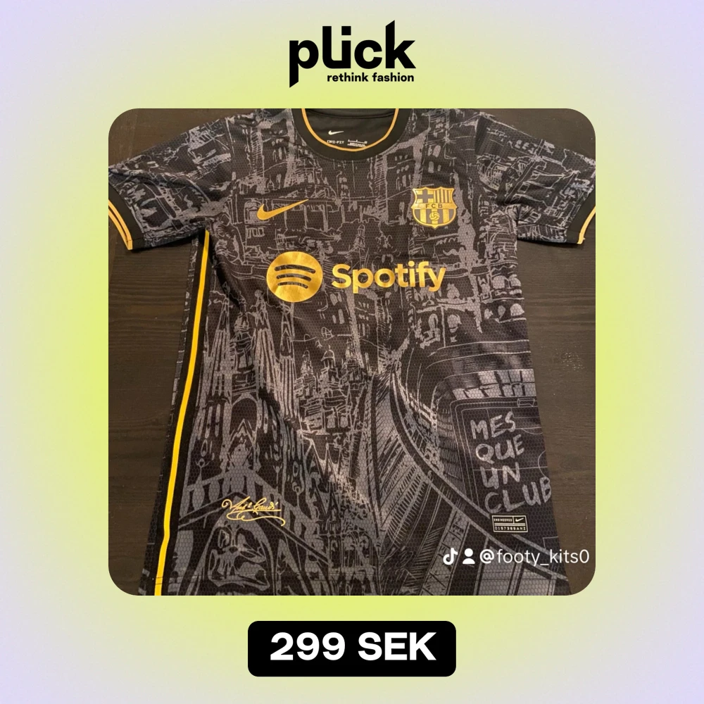 Säljer en svart fotbollströja från Nike med Barcelonas emblem och Spotify-logga i guld. Tröjan har ett unikt mönster med texten 'Mes Que Un Club' och UNHCR-logga på baksidan. Kortärmad och perfekt för fans! 🖤💛