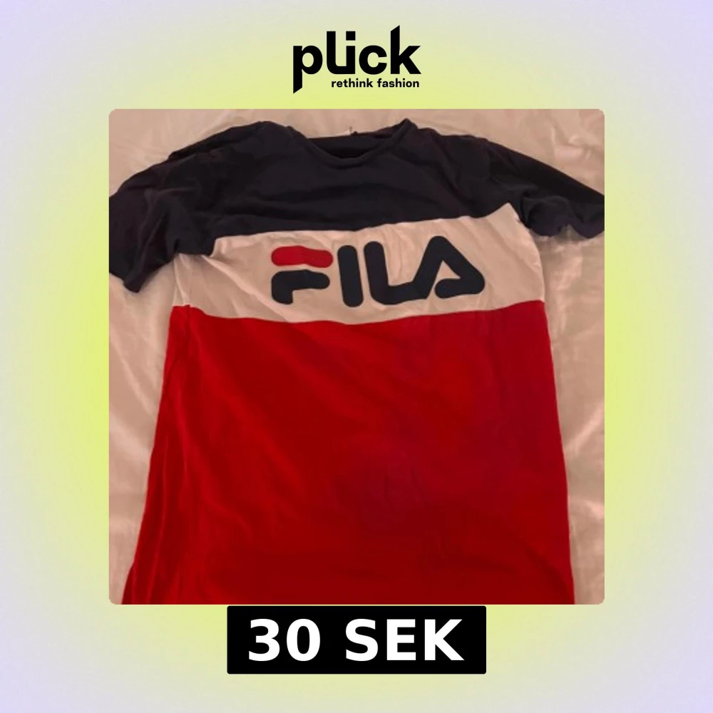 Snygg FILA t-shirt med breda blockränder i marinblått, vitt och rött. Stor FILA-logga framtill. Klassisk rund hals och korta ärmar. Perfekt för dig som gillar sportig och street-inspirerad stil. Mjuk bomullskvalitet som är skön mot huden. Skickar bild på ifall det önskas.