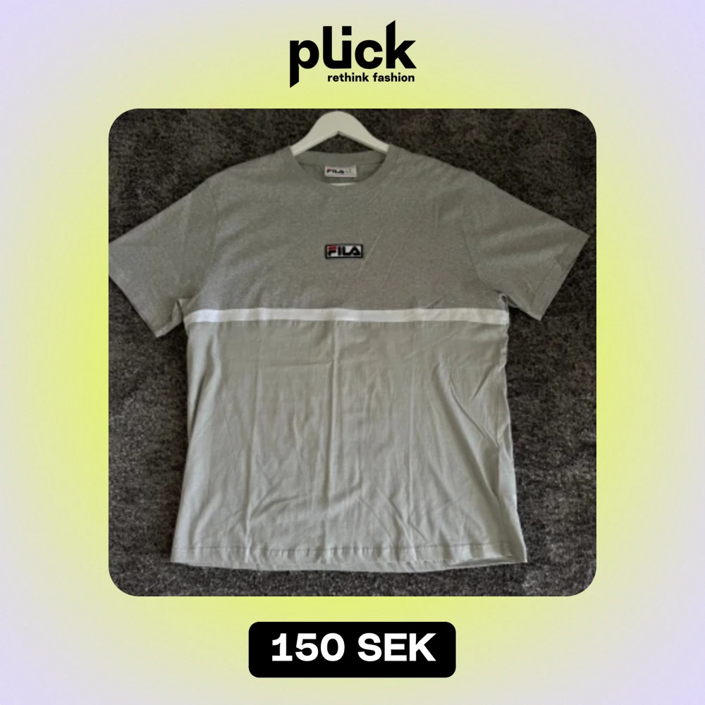 Säljer en snygg grå t-shirt från FILA. Den har en klassisk design med en vit rand över bröstet och FILA-loggan broderad ovanför. Perfekt för en avslappnad stil, oavsett om du ska till gymmet eller bara hänga med kompisar. T-shirten är i bomull och har korta ärmar.