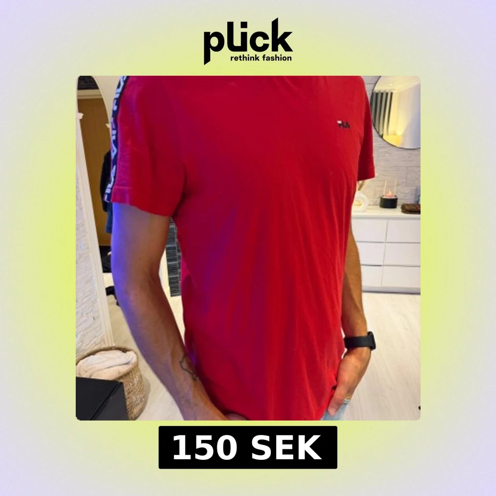 Säljer en röd t-shirt från FILA med svart och vit logga på bröstet och axlarna. T-shirten har korta ärmar och klassisk passform. Materialet är mjuk bomull och axlarna har snygga band med FILA-tryck för en sportig vibe. Passar bra s/m storlek.