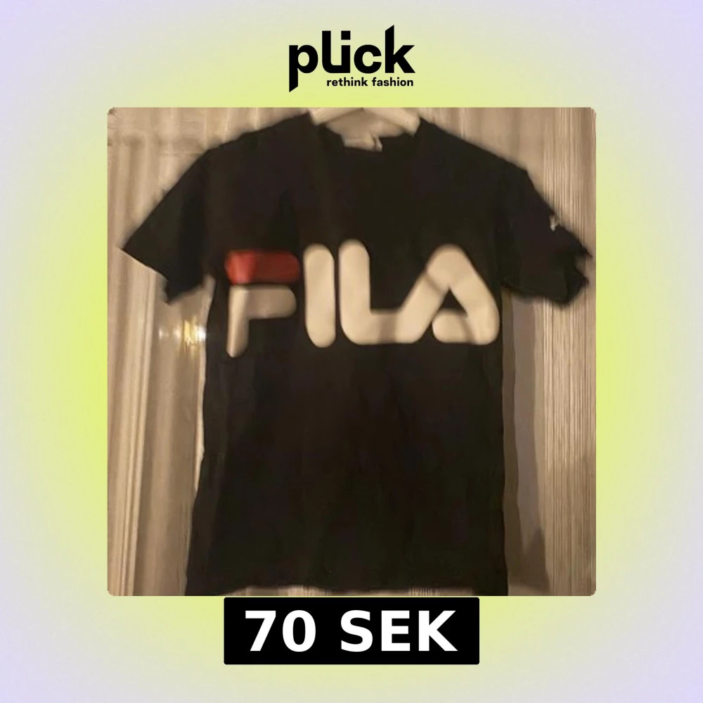 Svart t-shirt från FILA i storlek XS med stor vit och röd logga framtill. Klassisk rund halsringning och korta ärmar. Perfekt för dig som gillar sportiga och stilrena plagg med tydlig branding.