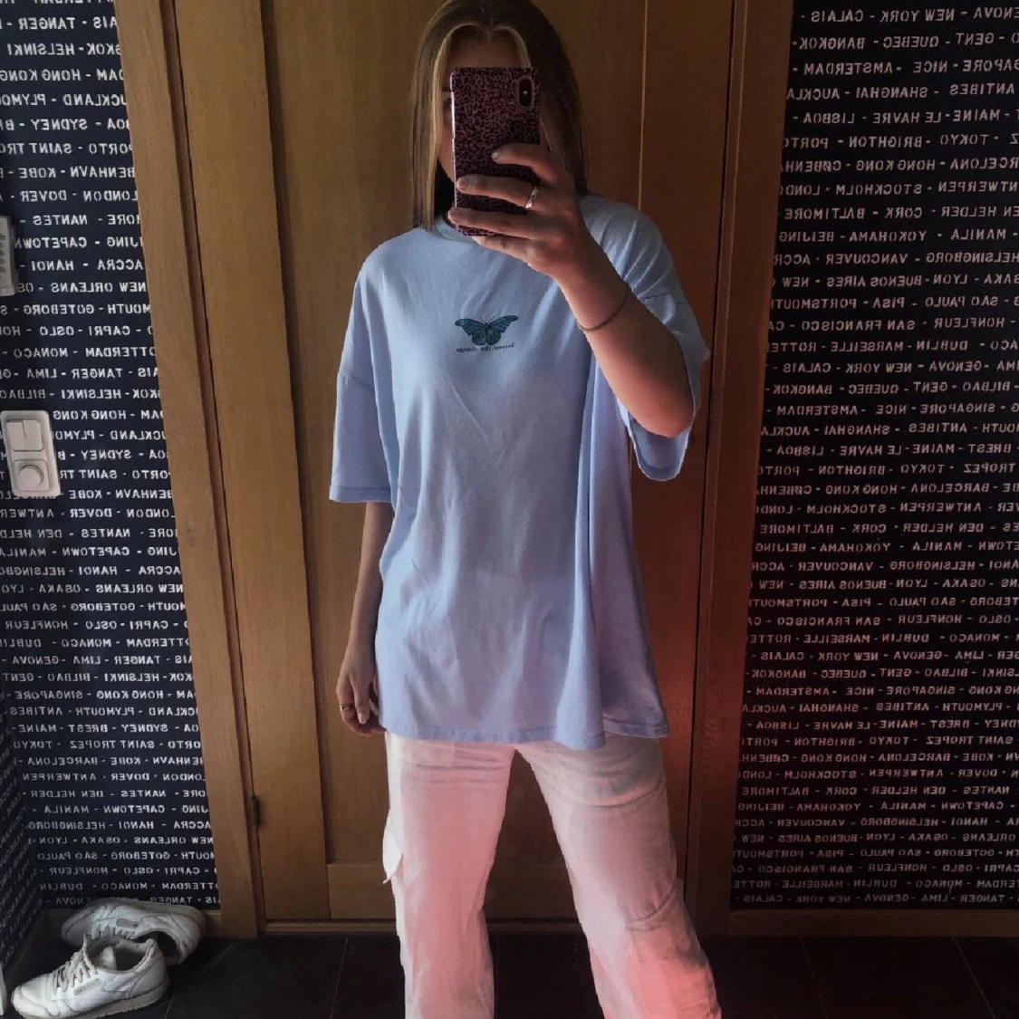 Supergullig ljusblå t-shirt med fjärilsmotiv, st S, skick 8/10🫶🏽