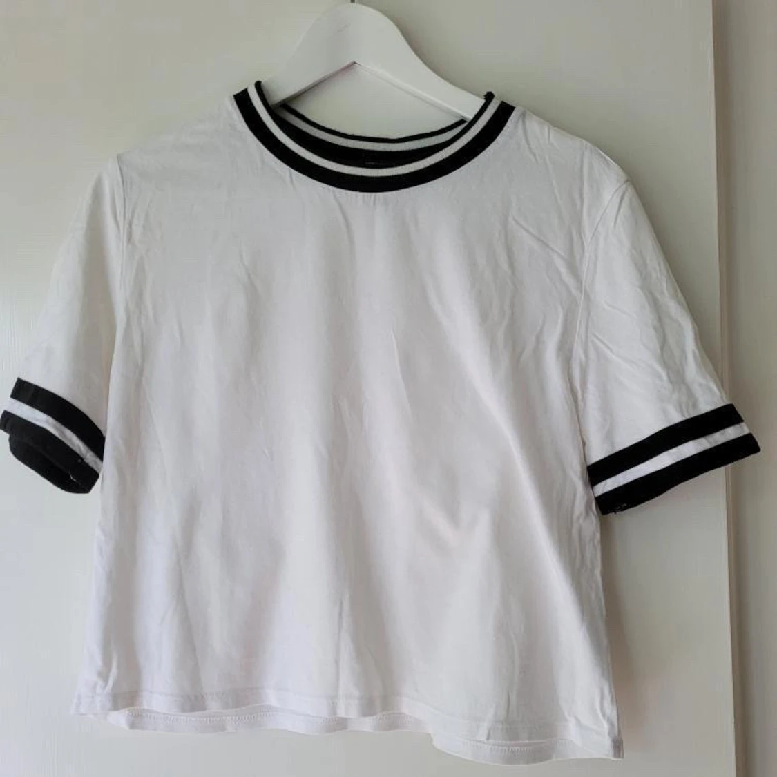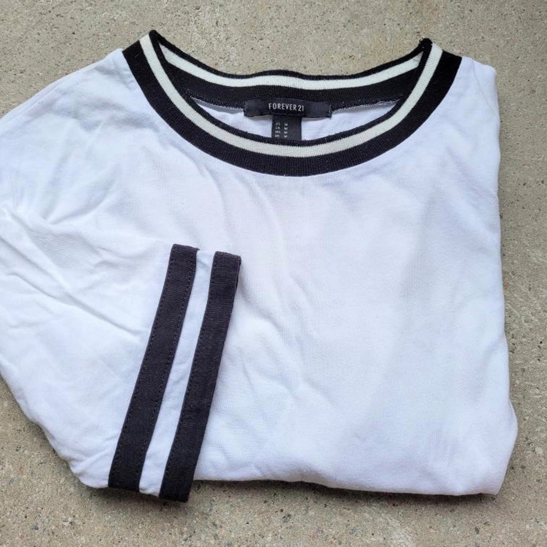 Vit T-shirt med ränder vid halseingning och ärmslut. Köpt på Forever21 i Japan. Sparsamt använd. Storlek M. Skönt material (50% bomull 50% modal).