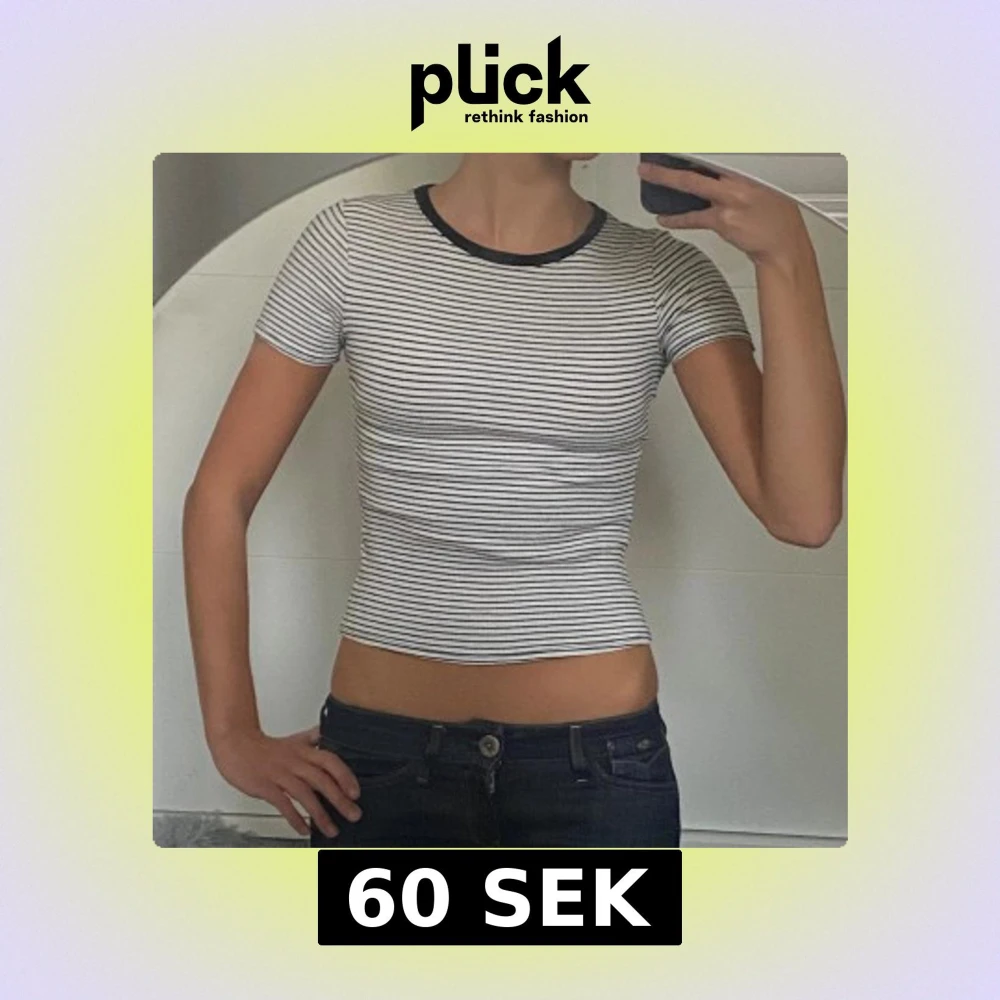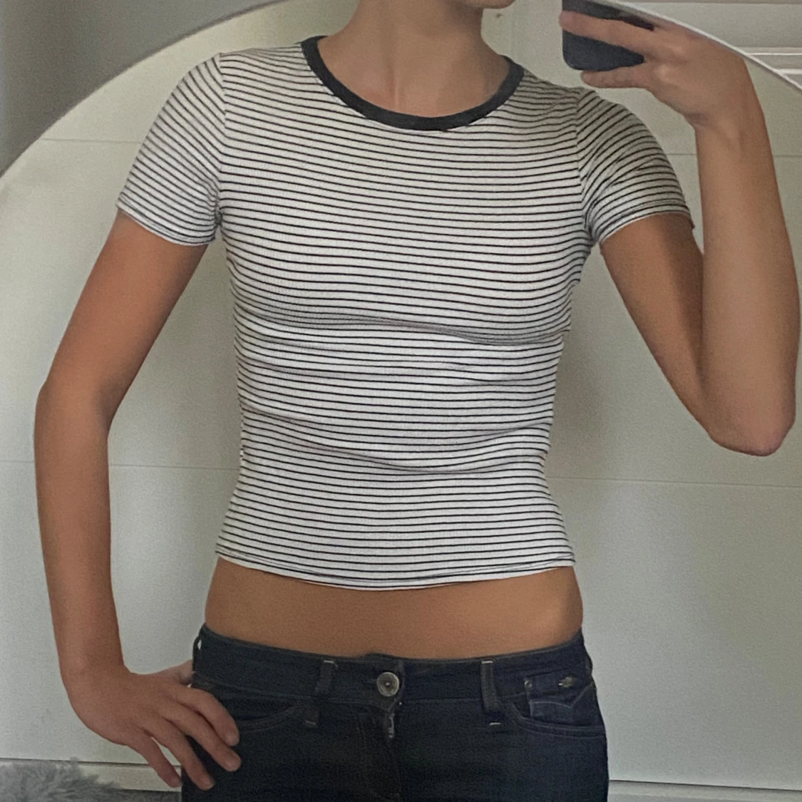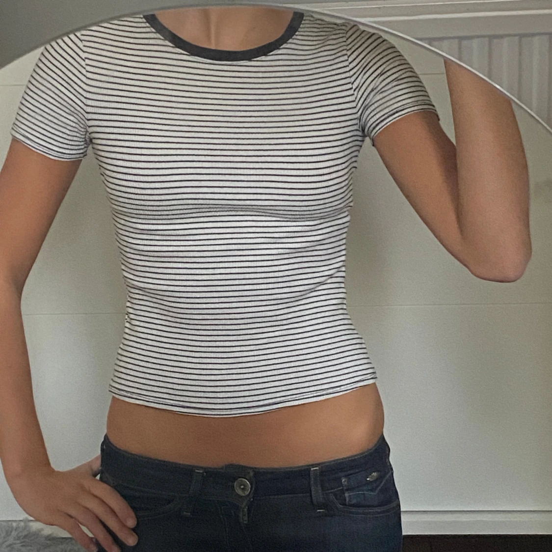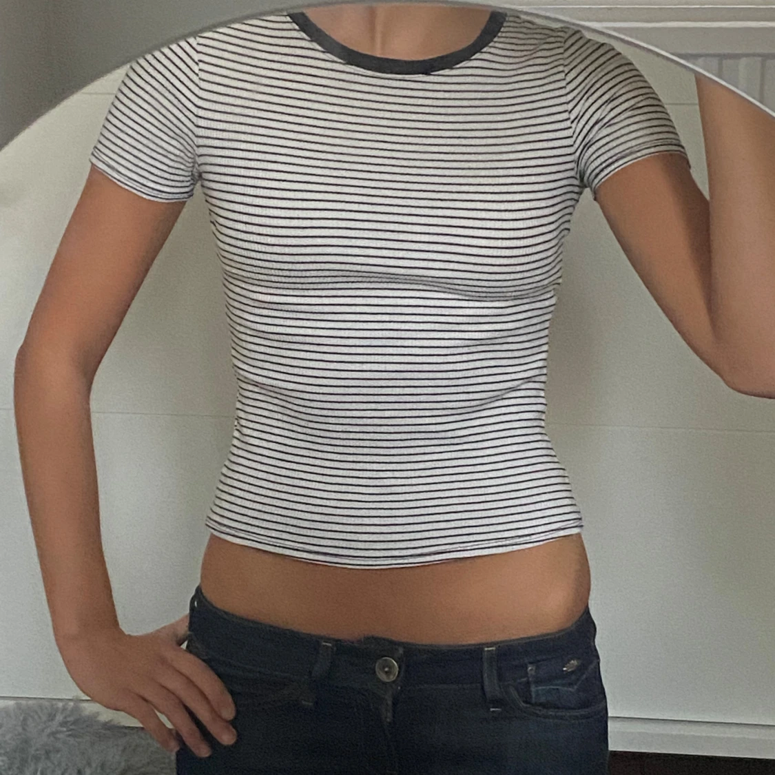 Säljer en vit och svart randig croppad topp med korta ärmar och rund halsringning med svart kant. Toppens passform är tight och den är tillverkad i ett ribbat material. I storlek xs.