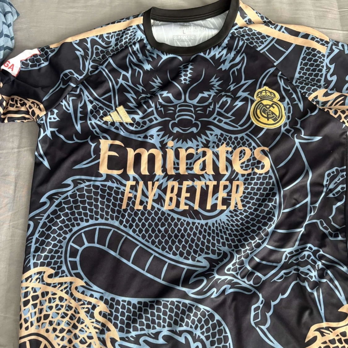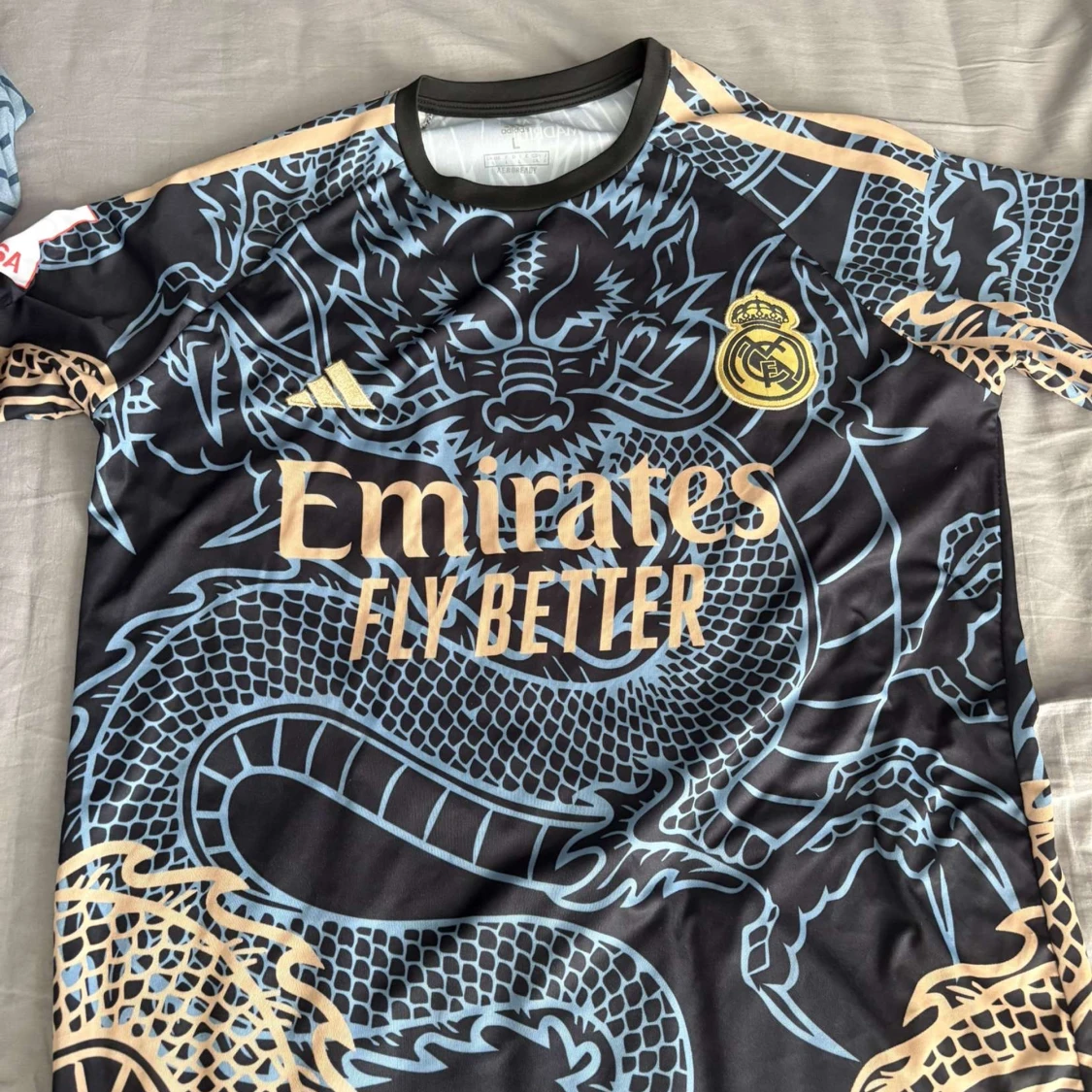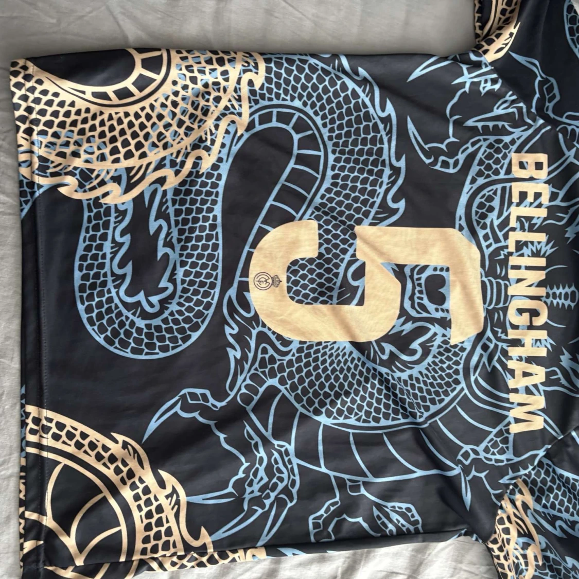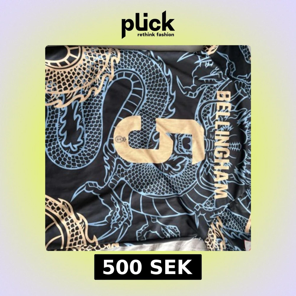Snygg Real Madrid fotbollströja med Bellingham 5 på ryggen. Svart bas med guldiga och ljusblåa drakdetaljer, klubbmärke och Adidas-logga framtill. Kortärmad modell i lätt och ventilerande material, perfekt för match eller träning. PRIS KAN DISKUTERAS