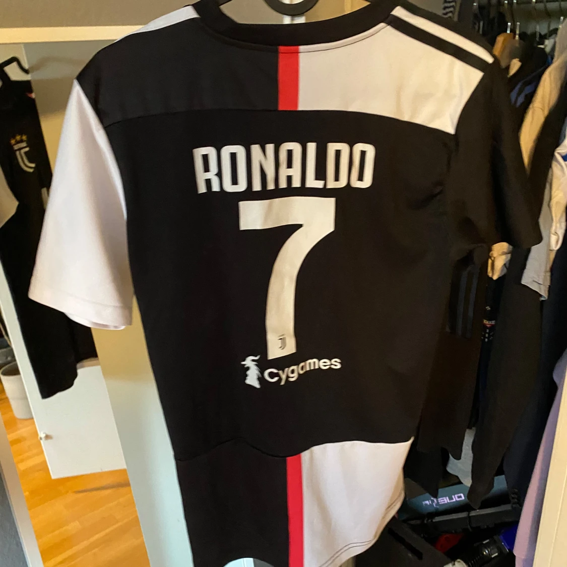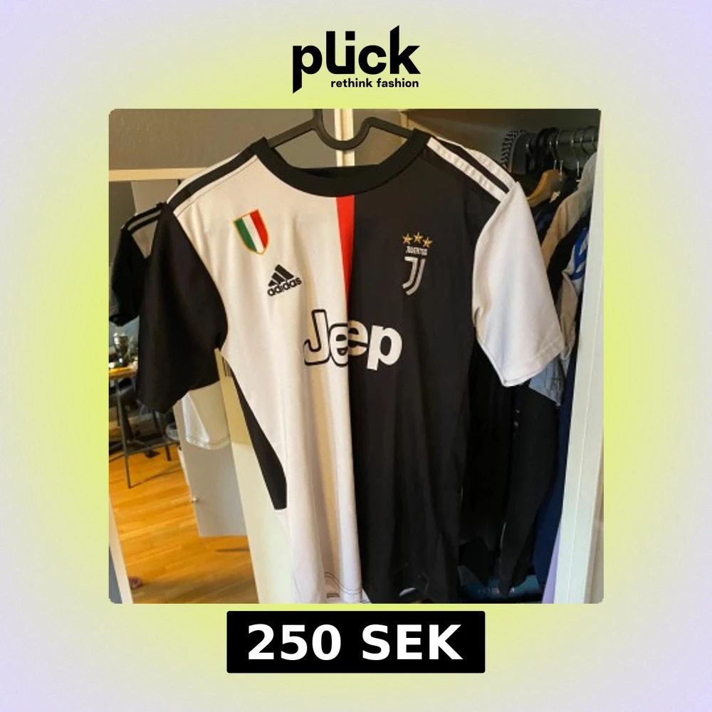 Juventus officiella matchtröja med Ronaldo 7 på ryggen. Tröjan är svart och vit med en röd rand i mitten, kortärmad och tillverkad i lätt och ventilerande material. Adidas-logga, Juventus klubbmärke och Jeep-sponsor på framsidan.