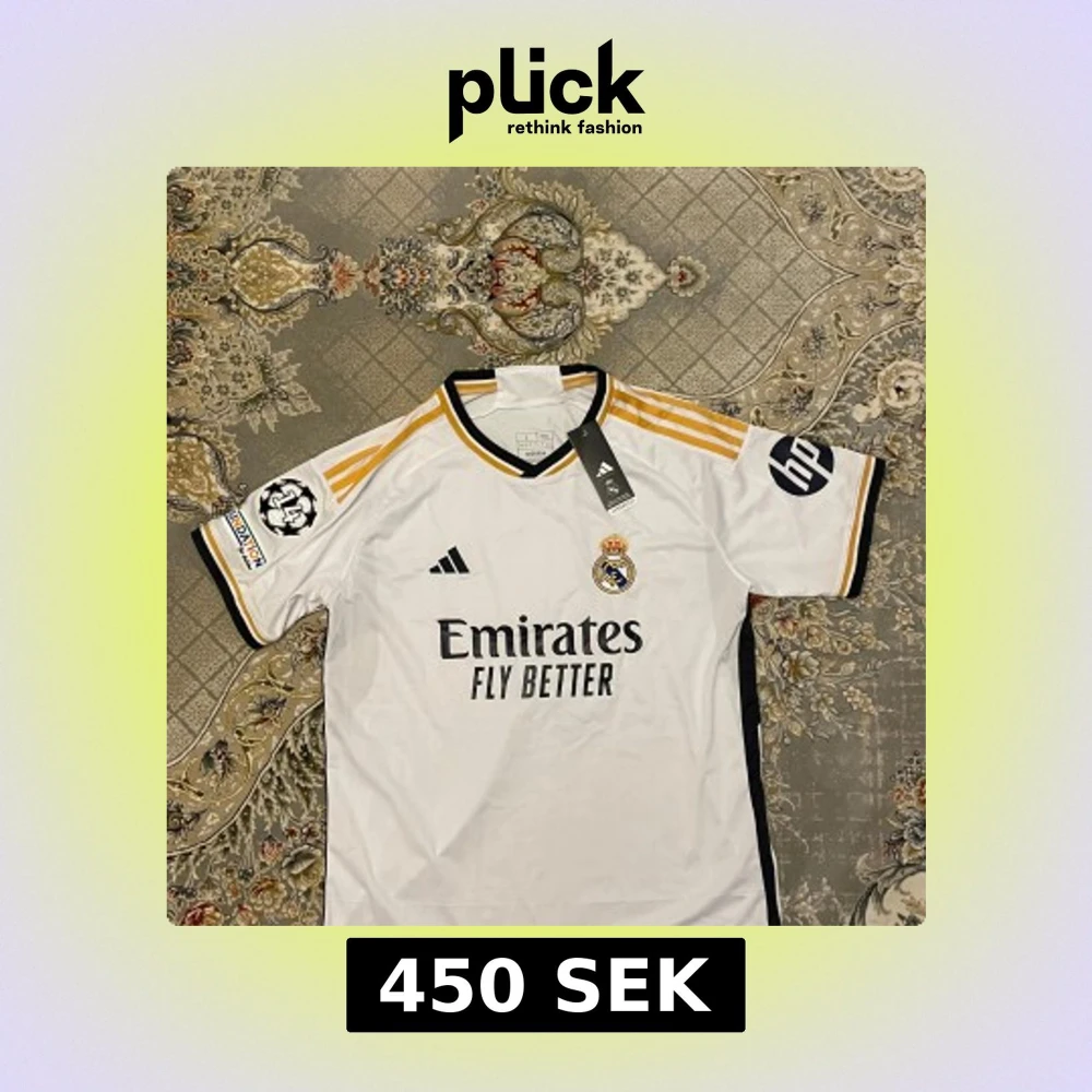 Säljer en vit Real Madrid fotbollströja från Adidas med svarta och gula detaljer. Tröjan har korta ärmar och texten 'Emirates Fly Better' på framsidan. Baksidan har namnet 'Bellingham' och nummer 5. Perfekt för fotbollsfans!