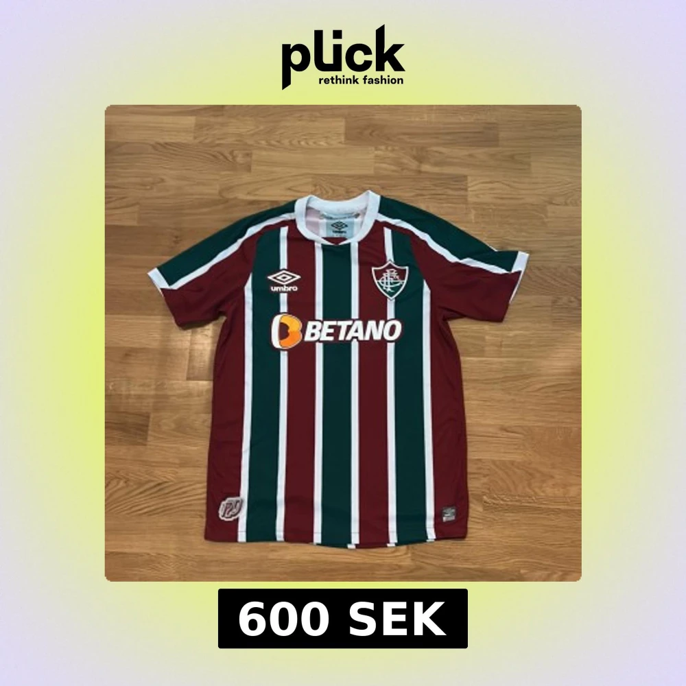 Säljer en officiell Fluminense fotbollströja från Umbro, jubileumsmodell 120 år. Tröjan har breda vertikala ränder i vinrött, grönt och vitt, med klubbmärke broderat på bröstet och Betano sponsortryck. Rund hals och korta ärmar, tillverkad i lätt polyester.