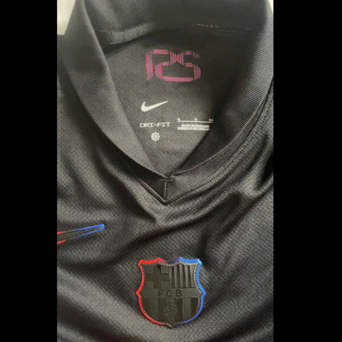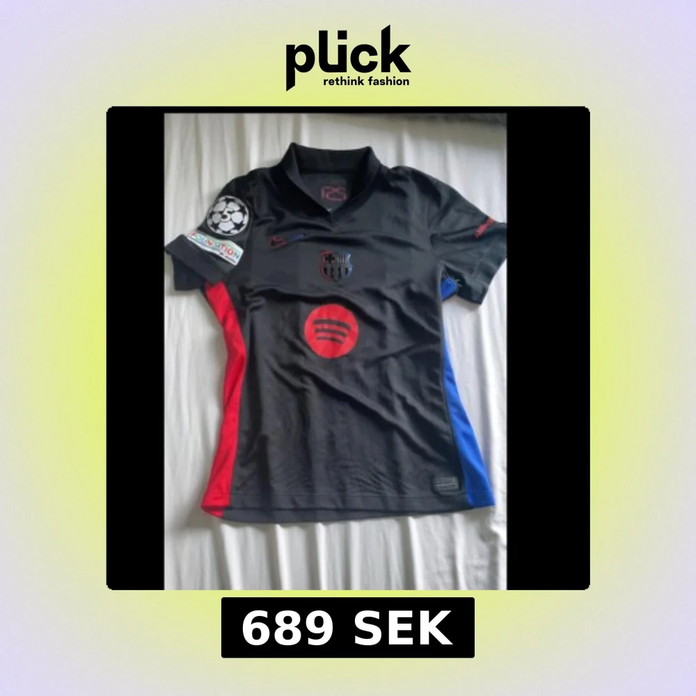 Säljer en svart FC Barcelona matchtröja från Nike med Dri-FIT-material. Tröjan har korta ärmar, klubbmärke i svart med röd och blå kant, röd Spotify-logga på bröstet. Snygga röda och blå detaljer på sidorna. Passar XS Kvitto och Barcelona bag finns, köpt från butiken i Barcelona