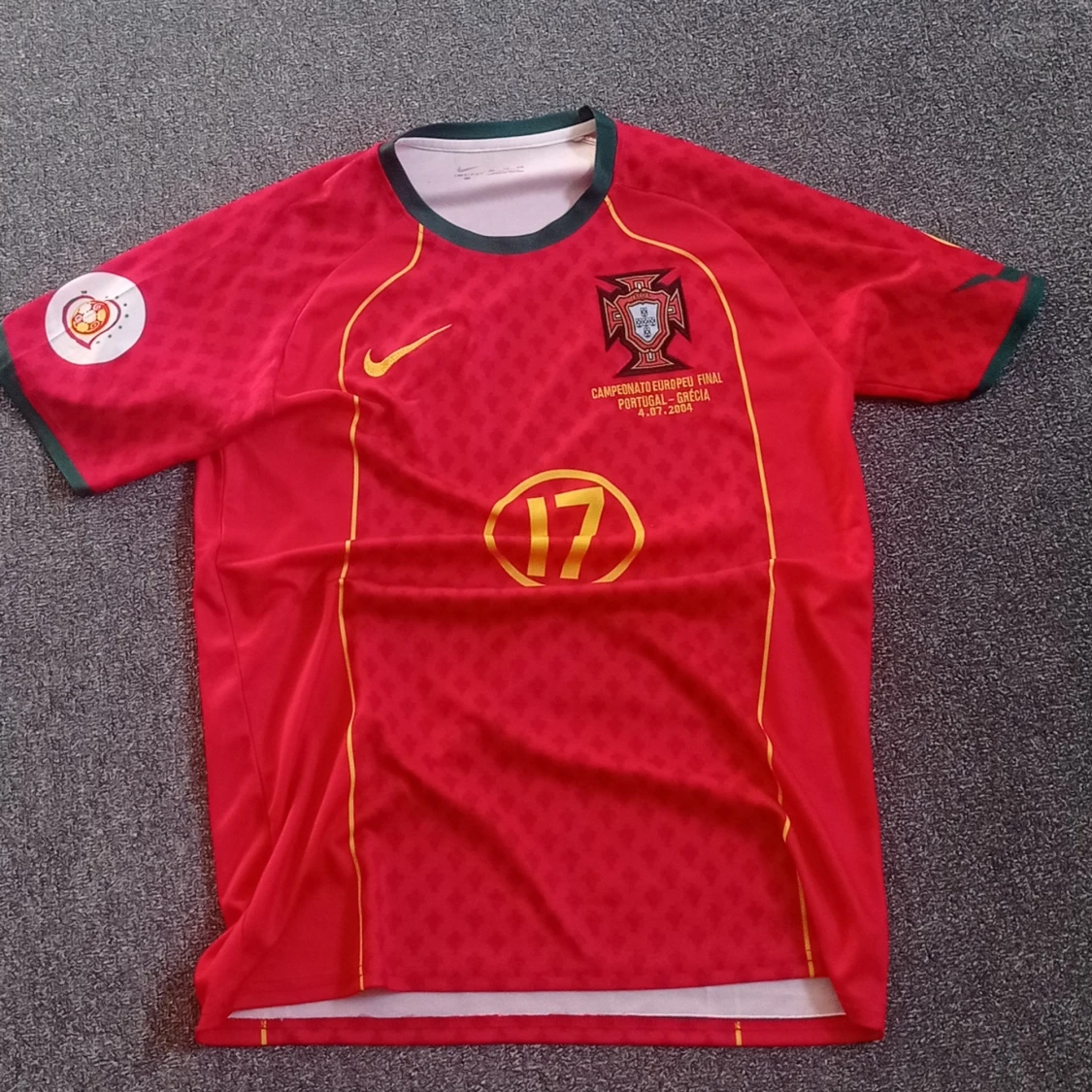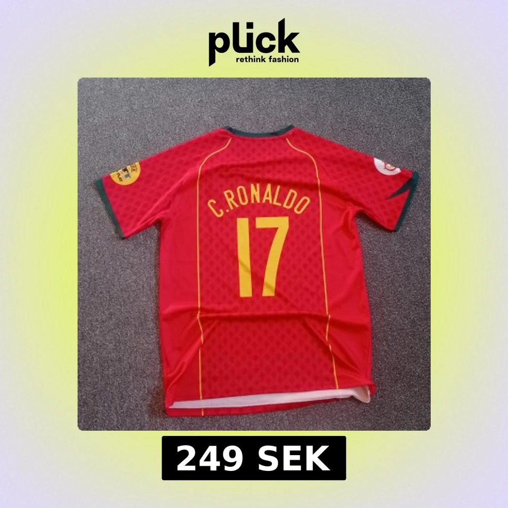 Säljer en röd Portugal fotbollströja från Nike med C. Ronaldo och nummer 17 på ryggen. Tröjan har gula detaljer, gröna muddar och officiella tryck från EM-finalen 2004. Tillverkad i lätt och ventilerande material, perfekt för fotbollsälskare.