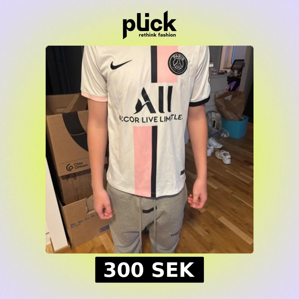 Modell är 184, och väger 68. Snygg PSG fotbollströja från Nike i vitt med en rosa och svart vertikal rand på framsidan. Tröjan har korta ärmar med svarta och rosa muddar, broderad Nike-logga och PSG-märke på bröstet. Tillverkad i lätt och ventilerande Dri-FIT material.