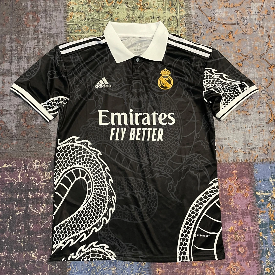 Snygg Real Madrid fotbollströja från Adidas med ett coolt drakmönster i vitt. Priset kan diskuteras!