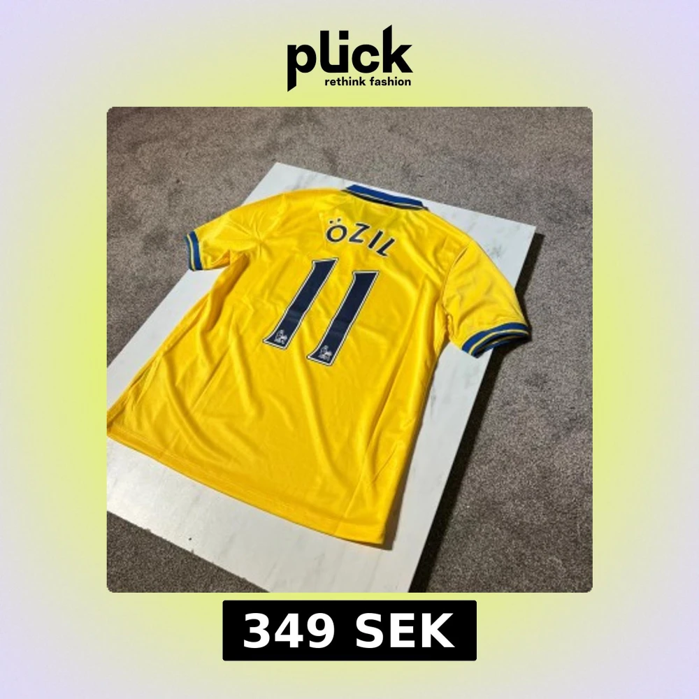 Gul Arsenal bortatröja med blå detaljer, Özil 11-tryck på ryggen. Klassisk pikékrage i blått med gula ränder, broderat Arsenal-märke och Nike-logga på bröstet. Tillverkad i lätt och ventilerande polyester, perfekt för match eller samling.